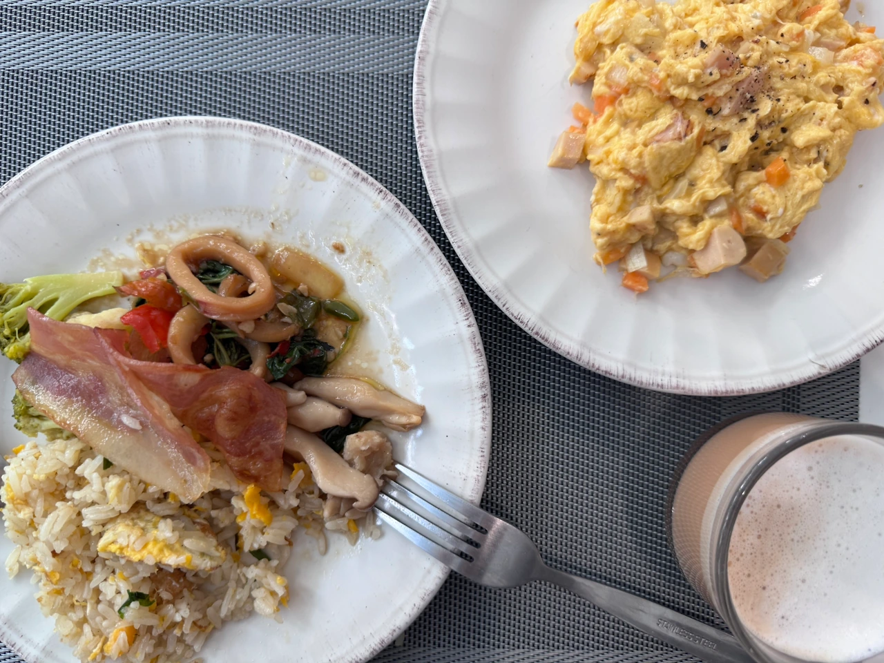 밀크티를 뽑아와 원하는 음식을 퍼와서 자리에 앉았다.