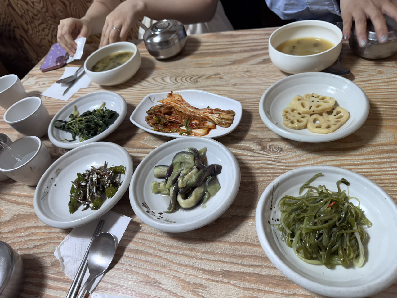 가지나물, 연근무침, 미역줄기무침 등 다양한 반찬이 깔리고