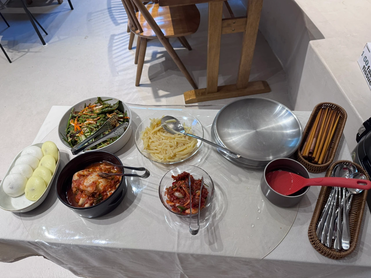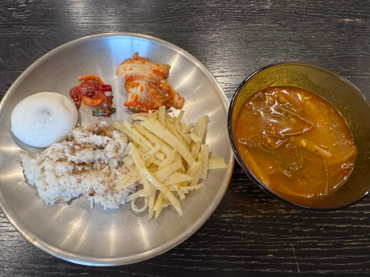 오늘의 아침은 젓갈, 김치, 감자채볶음, 떡, 부추겉절이, 육개장이었다.