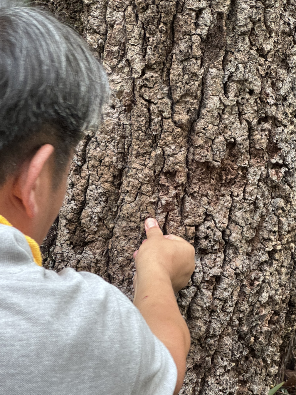 코르크처럼 푹신푹신하다고 말씀해주셔서 손으로 나무 껍질을 눌러보았다.