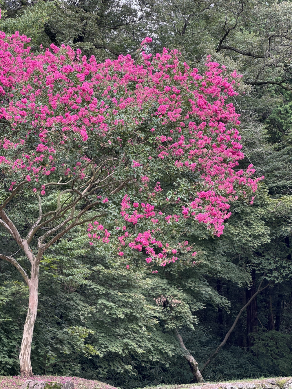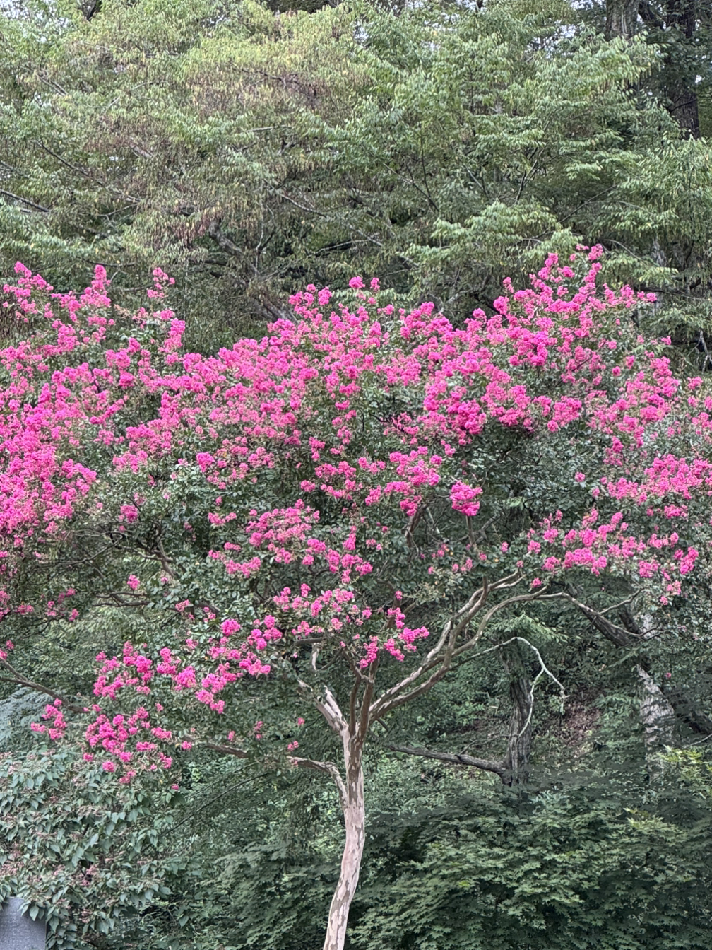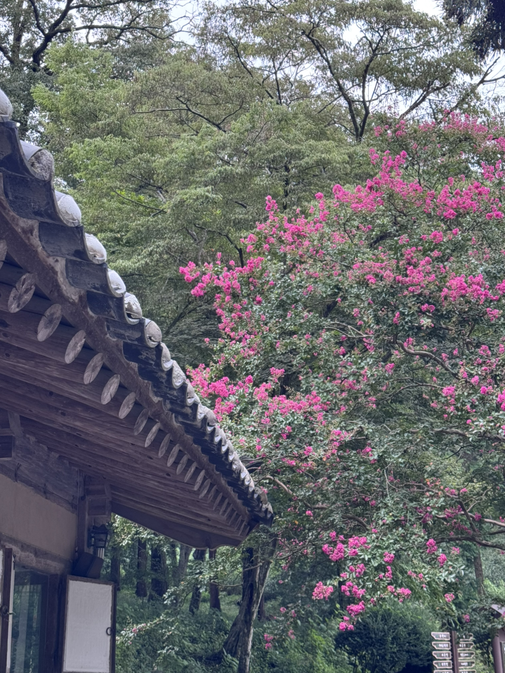 오래되어 색이 발한 고택과 분홍의 대롱나무의 대조가 눈에 띄었다.