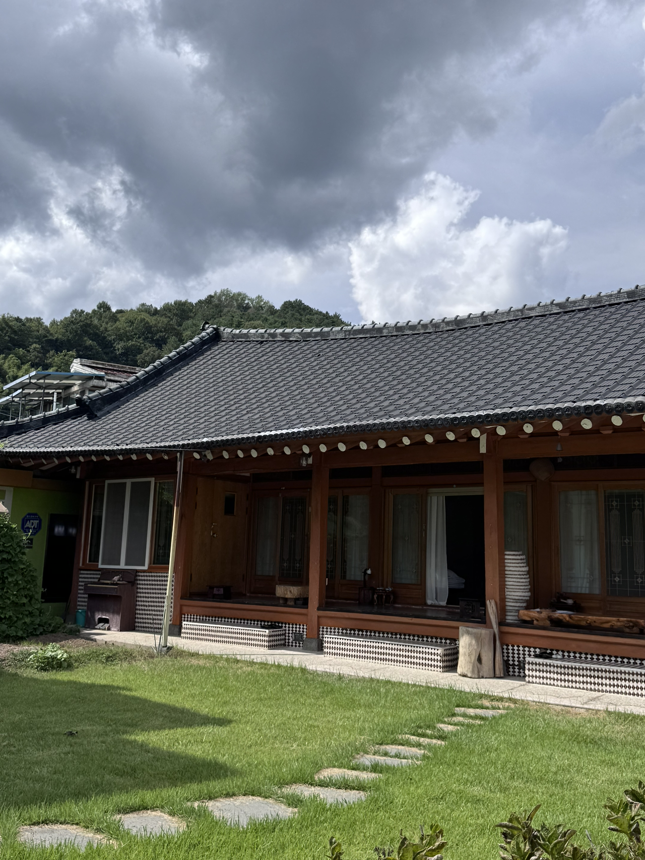 푸른 잔디와 한옥이 어우러진 공간.