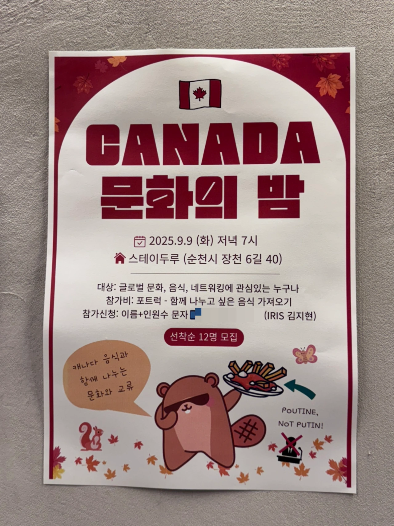 캐나다 식 감자튀김인 '푸틴'과 곁들일 각자의 음식을 챙겨오면 되는 것이었다.