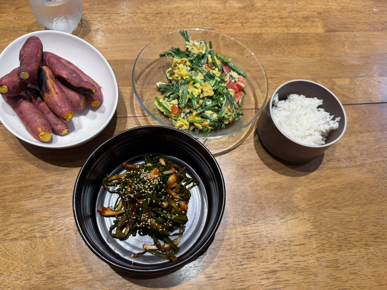 고구마와 파김치, 스크램블, 약간의 흰밥.