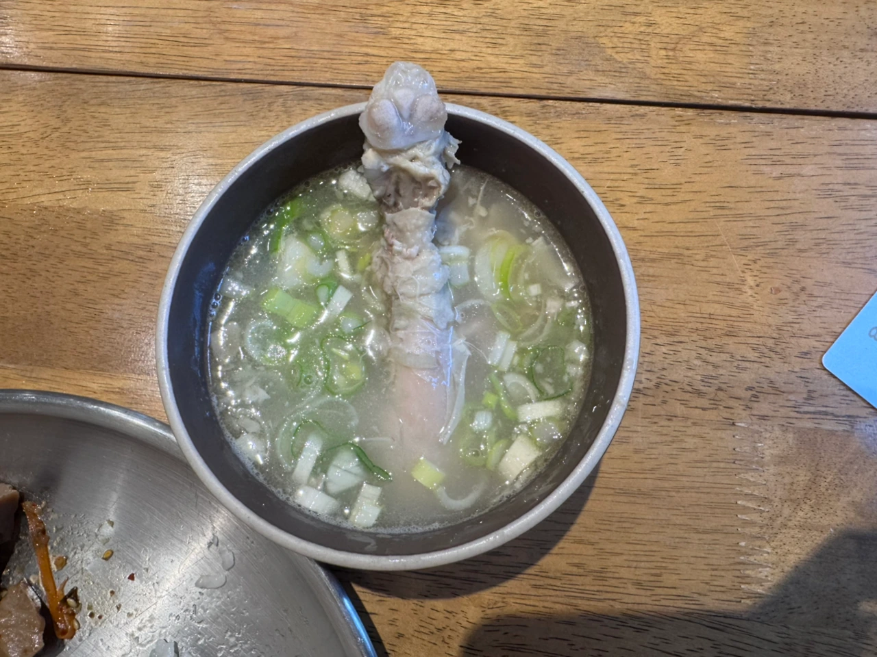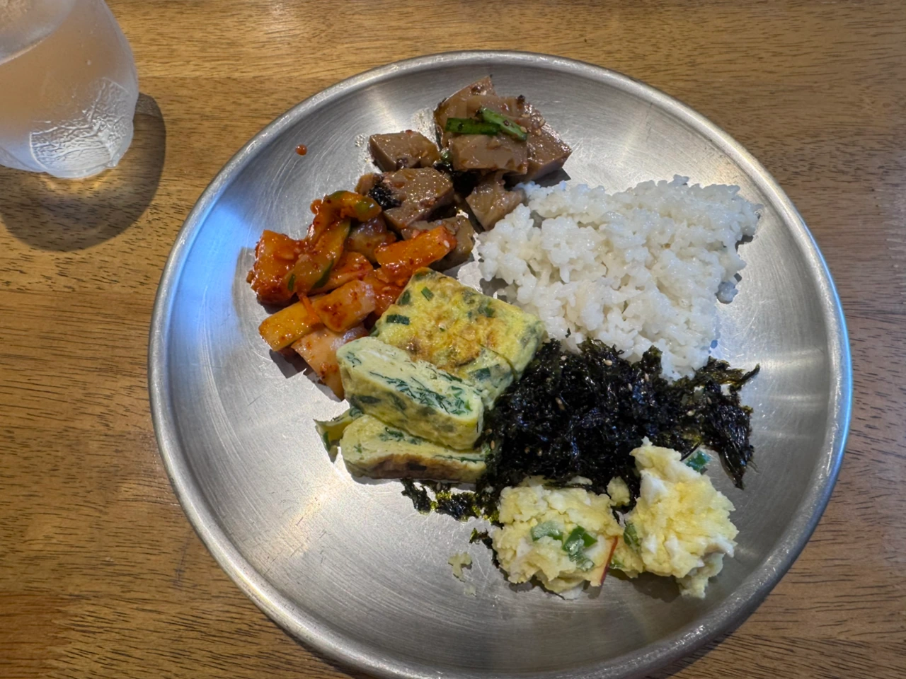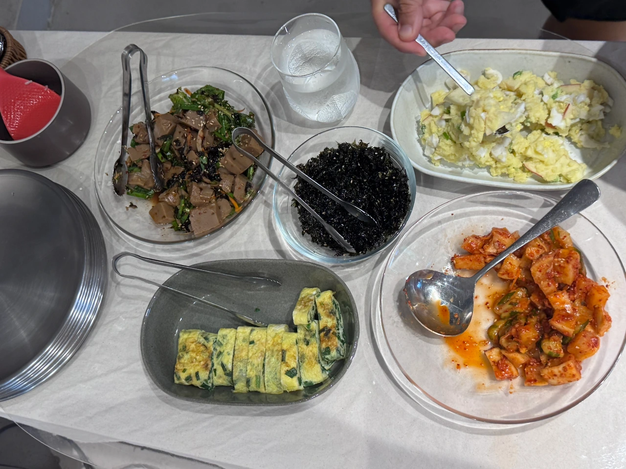 계란말이, 깍두기, 감자샐러드, 도토리묵, 닭곰탕으로 든든하고 맛있게 한 끼를 먹을 수 있었다.