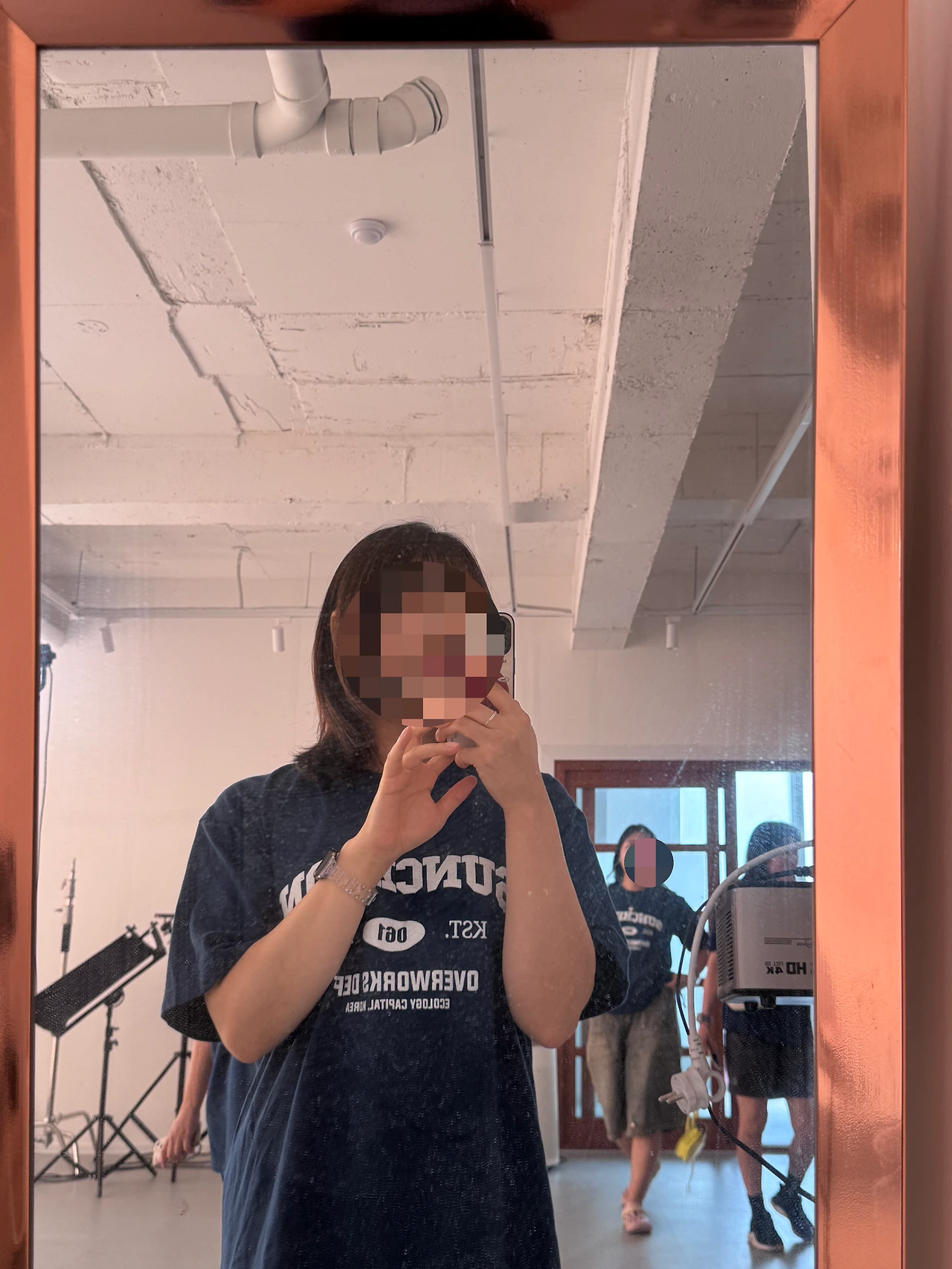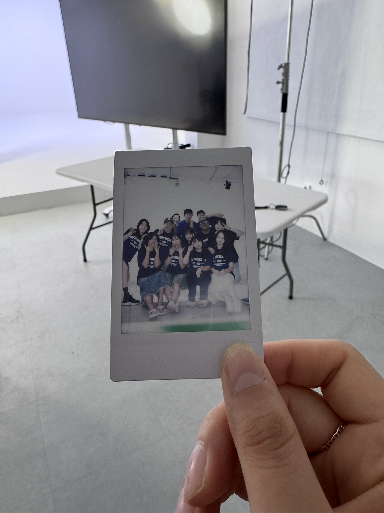 사진을 갖는 사람이 가운데에서 손가락으로 가리키는 게 사진의 포인트이다.