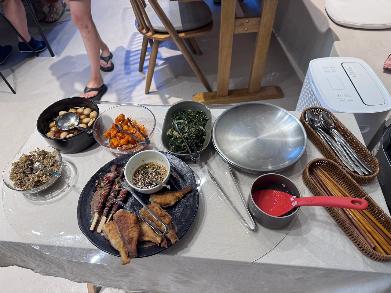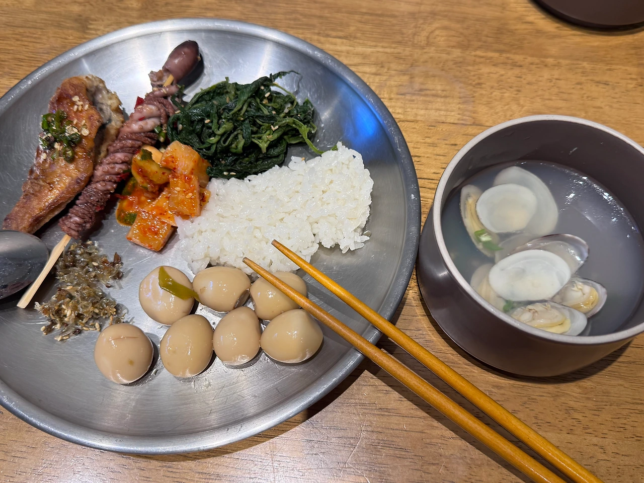 메추리알 장조림과 생선구이, 낙지호롱이, 깍두기, 멸치볶음, 시금치나물과 바지락조개국까지!