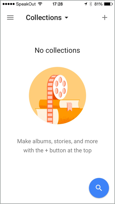 어떤 디자이너들은 빈 화면이나 에러 메시지를 창조력을 발휘할 수 있는 백지와 같이 생각합니다. 아래는 Google Photo 앱의 빈 화면입니다.