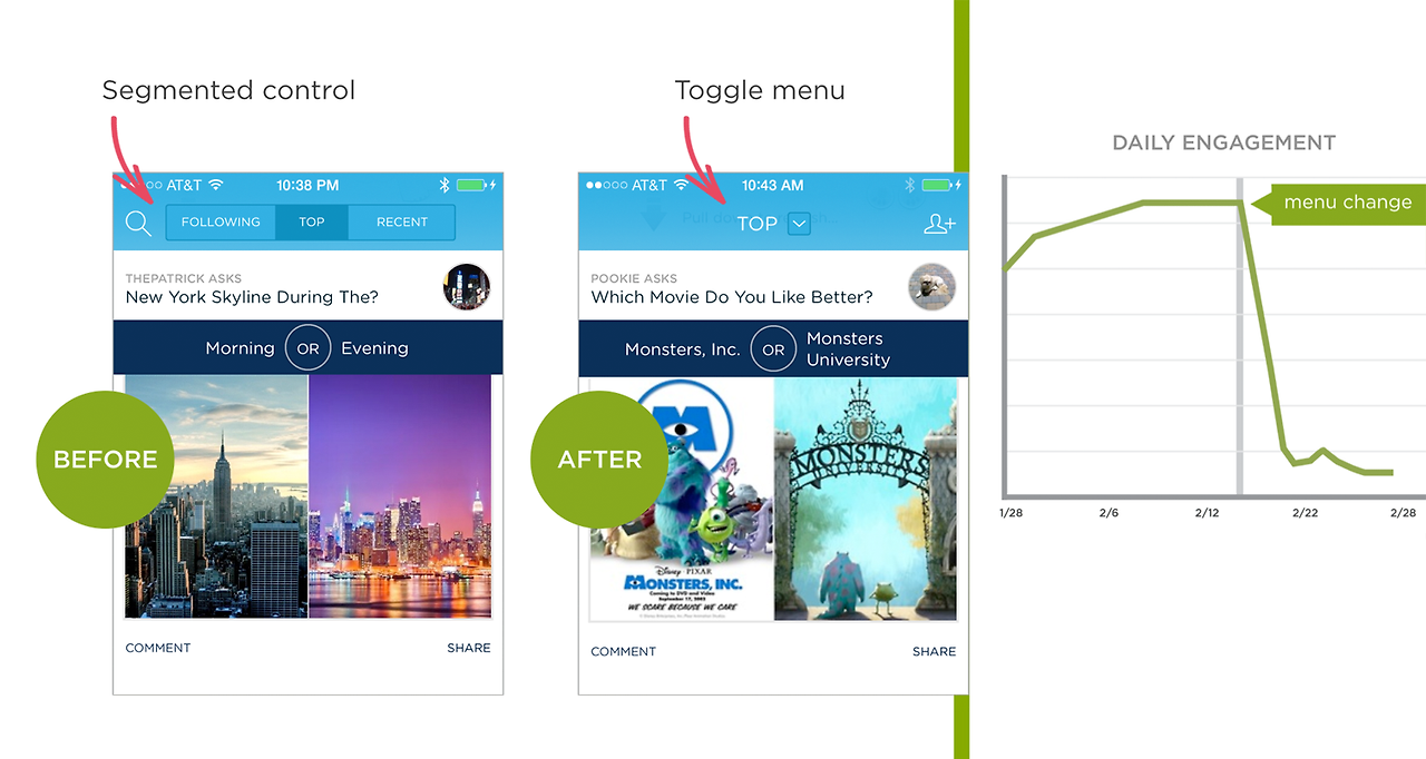 이미 여러 곳에서 이루어진 A/B 테스팅 결과(링크)를 요약하자면, 메뉴를 명시적으로 표기하는 것이 유저 참여도, 만족도, 심지어는 수익까지도 증가시킵니다.