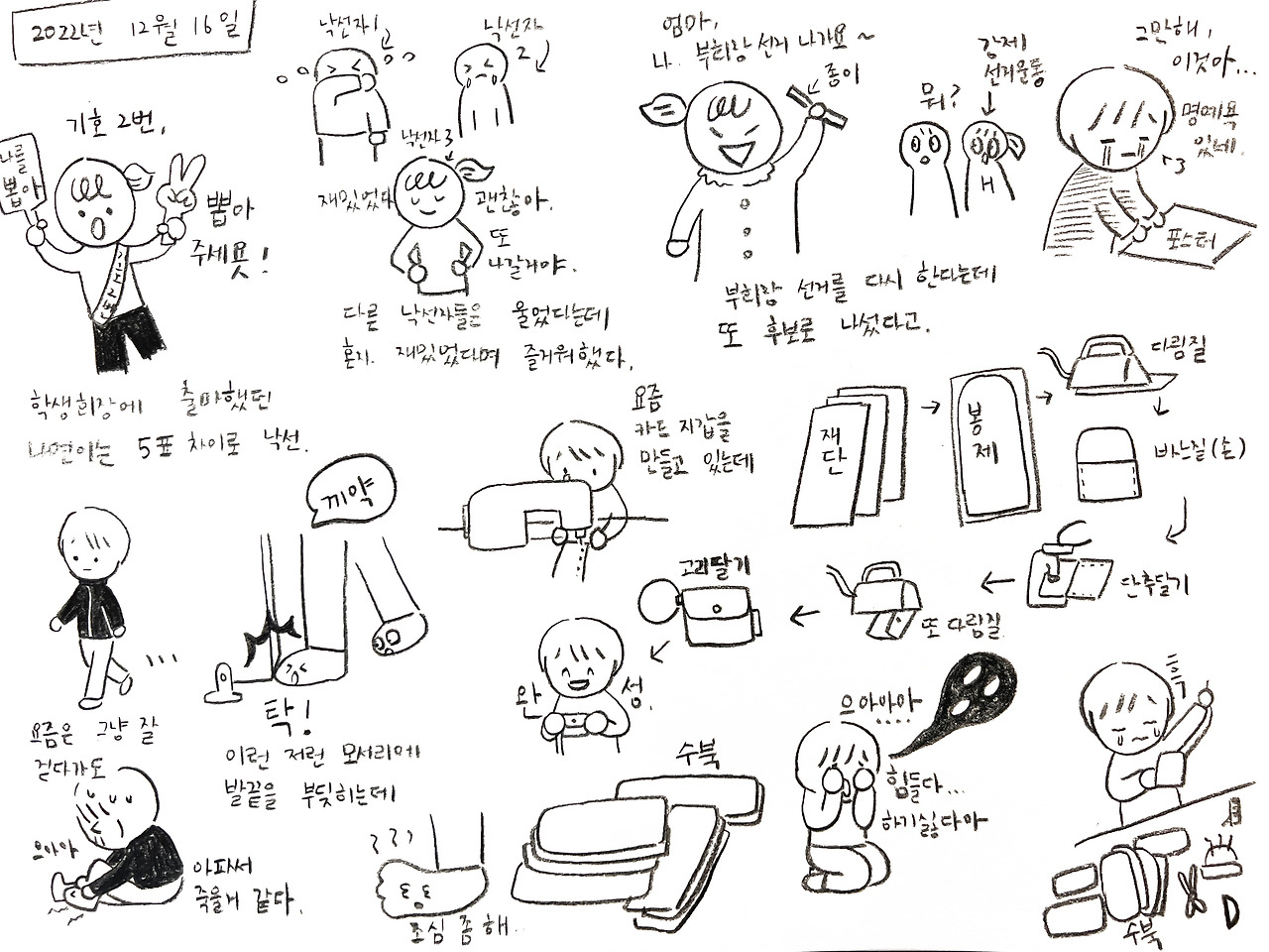 전교회장에 낙방한 나연이가 지치지도 않고 전교 부회장 선거에 출마했고 내 발은 자꾸 모서리 여기저기에 부딪히기 시작했으며 단순작업이 힘들어도 결과가 있어 뿌듯한 하루였다.