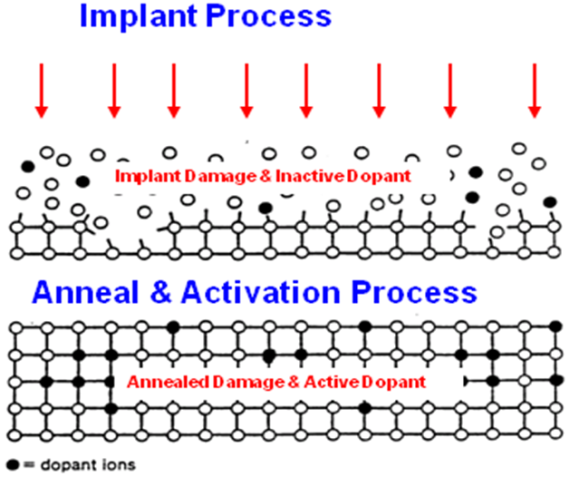 Si matrix 내로 ion implant 진행하게 되면 B, As 등의 impurity를 Si과 공유결합으로 dopant activation 시키기 위해 후속 annealing 진행합니다. 다시 말해 implant 장비가 당연히 필요하고 후속 annealing 장비 또한 필요합니다.