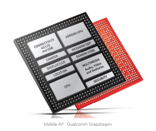또한 스마트폰에 다양한 반도체 [AP(Application Processor), 다양한 메모리 반도체 (DRAM, NAND 등)] 가 내장되어 있는 것은 이미 알고 있을 것이다. 특히 AP의 경우 흔히 착각하는 것 중 하나가 PC의 CPU로 동일시하는 것인데 이것은 반은 맞고 반은 틀리다. AP는 SOC (System on Chip) 형태로 CPU와 더불어 반도체 및 통신 모듈, 위치 센서 등 다양한 것들이 하나의 칩으로 결합되어 있는 상태를 뜻한다.