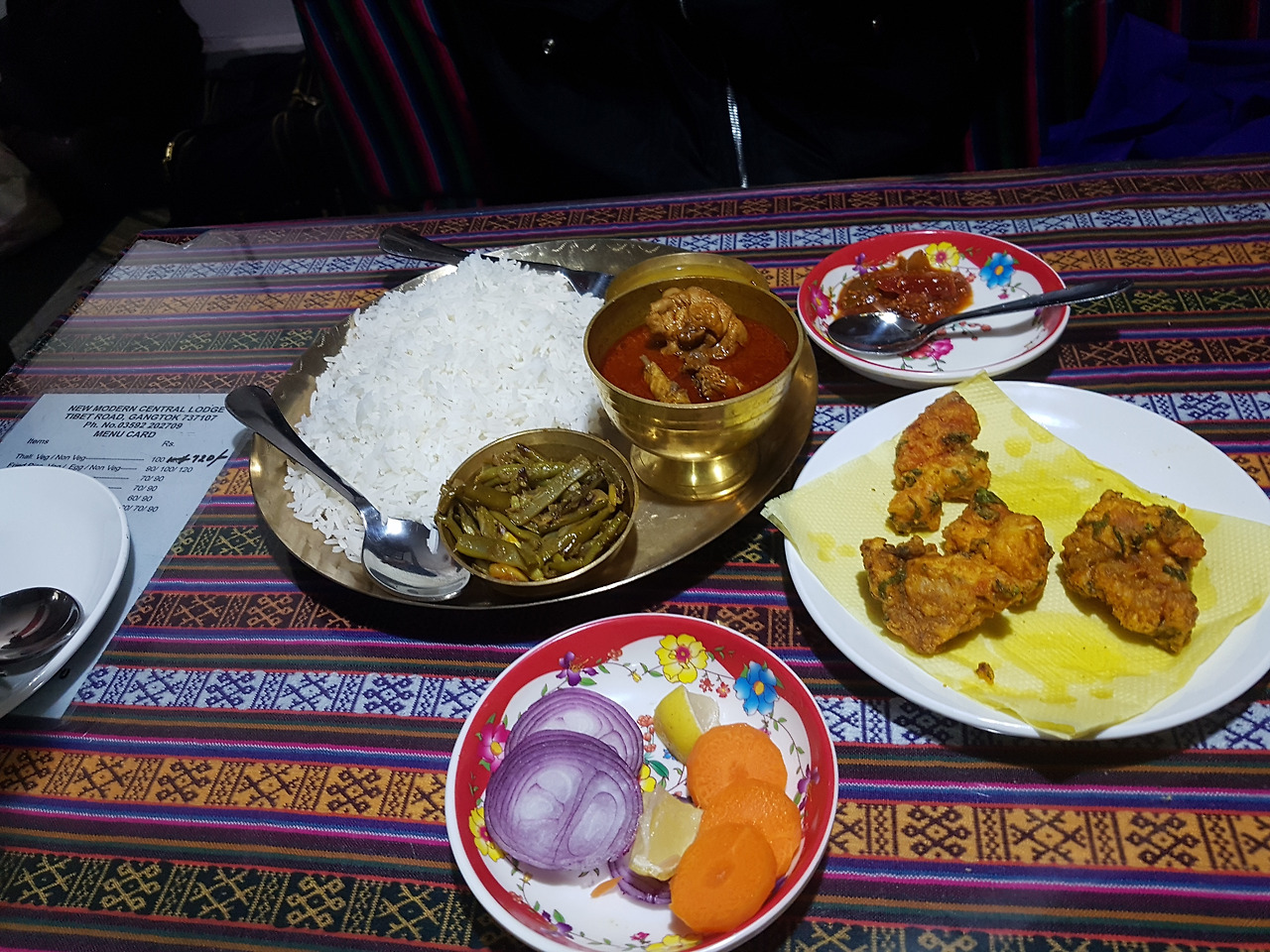 체력이 떨어진 뒤였어서 가볍게 숙소에서 밥을 먹었다. 중국과 철전지 원수사이인 인도와 중국, 그리고 그 국경지대인 시킴이지만, 여기 음식들은 모든것들이 약간 중화풍을 겉돌았다. 한국 치킨맛인것 같으면서도 중화풍의 소스가 곁들어진 치킨 칠리, 그리고 치킨이 곁들여진 탈리에 치킨프라이 까지, 순수하게 아무것도 안하고, 이동만 하는 날이었지만 지역을 이동한다는 것은 너무나 많은 체력을 소모하는 것 같다.
