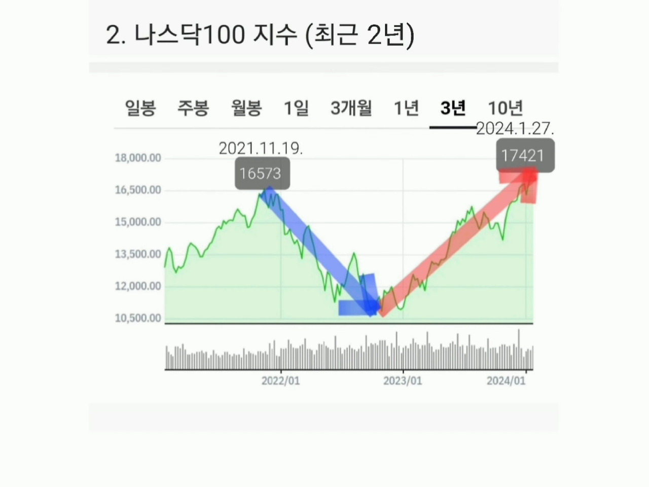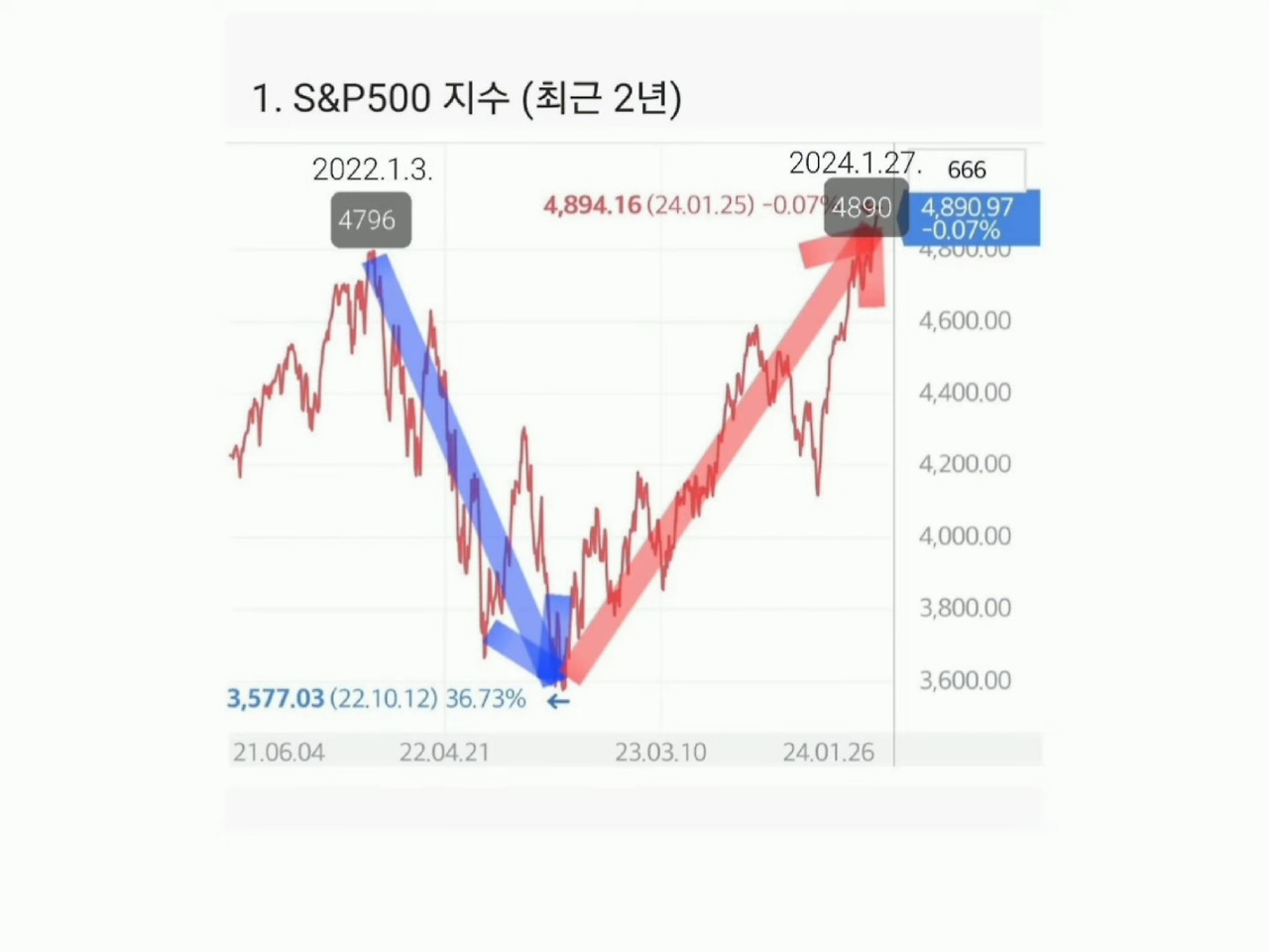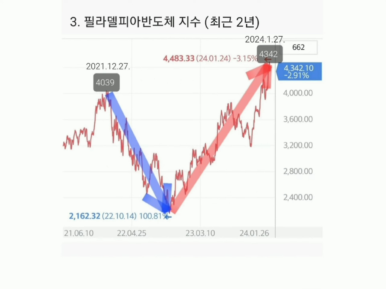 2022년 일 년 내내 S&P500 지수, 나스닥100 지수, 필라델피아반도체 지수 등 미국의 주요 지수들이 일제히 폭락하여 2022년 연말에 바닥을 찍고 2023년 한 해 동안 꾸준히 상승하더니,