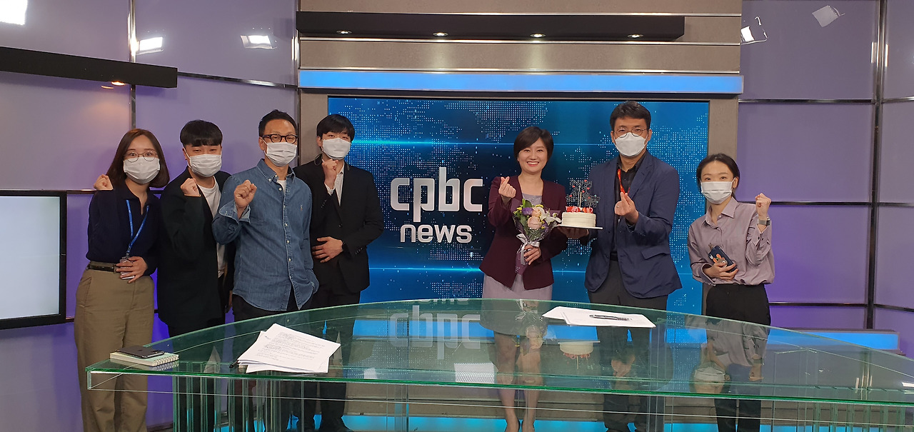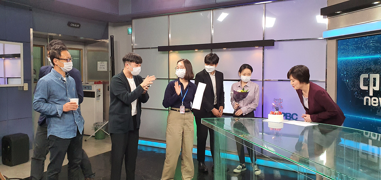 뉴스가 끝난 후, 선후배들이 케잌과 꽃다발을 들고 스튜디오로 들어와 앵커 재데뷔(?)를 축하해줬다. 고마웠다. 사진을 보니 그날의 추억이 새록새록 떠오른다.