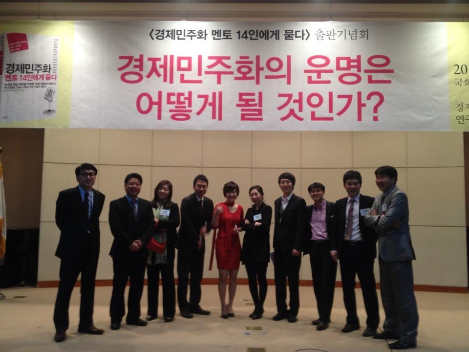 국회 출입기자들인 만큼, 출판기념회는 국회 의정기념관에서 열었다. 멘토가 되어준 전문가들도 초청했다. 유명인사들이 모이니 언론도 관심을 보였다. 내가 사회를 맡았고, 기자들과 함께하는 토크콘서트 형식으로 진행했다. 출판기념회가 무사히 끝나고 다같이 한잔했다. 건배사는 '경민아 사랑해'. '경민'은 경제민주화의 준말이다.
