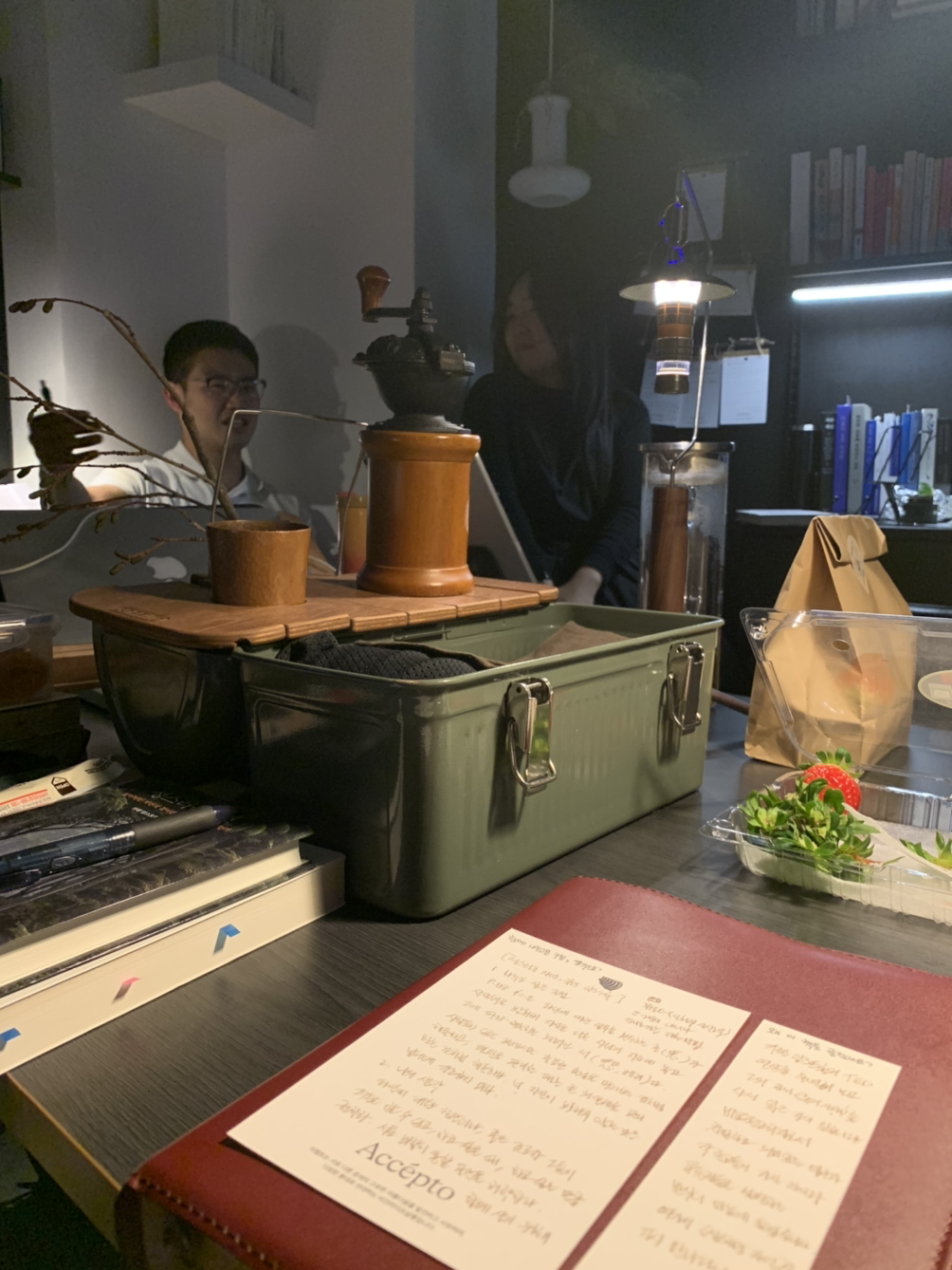 나는 항상 차의 트렁크에 캠핑 커피 박스와 여분의 커피를 챙겨 다닌다. 책 읽기 좋은 청명한 오후가 되면 나는 어김없이 볕이 잘 드는 곳에 자리를 잡고 향기로운 에티오피아 내추럴 커피 한잔과 책 한 권을 펼칠 준비가 되어 있다. 나에게 커피 마시는 시간은 나를 위로하고 타인을 환대하는 제의와도 같은 곳이다. 나는 언제부터 인가 이 캠핑 커피 박스에 매료되었다. 아마 에티오피아의 아름다운 여신이 나에게 대접하던 커피의 맛을 잊지 못해서 그랬는지도 모르겠다. 나는 젊은 시절 커피를 통해 전 세계를 떠돌아다녔다. 좋은 커피를 선별하고, 좋은 사람들과 친구가 되고, 그들의 형제가 되었다. 내게 커피는 사람과 사람, 세계와 세계를 연결하는 좋은 매개체였다. 그리고 나는 오늘 아쳅토(Accepto: 받아들이다라는 뜻, 어느 나라 말인지는 잘 기억나지 않는다)의 심야살롱에서 나만의 커피 세리머니를 할 것이다.