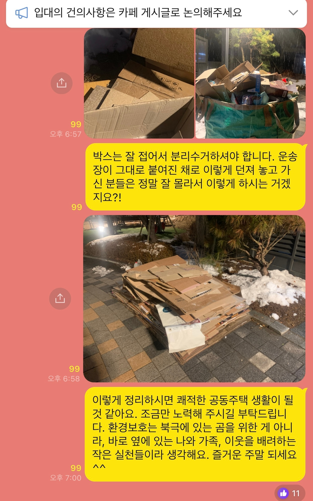 오늘도 어김없이 나는 단톡방에 잔소리하는 유반장이 된다. 11명의 좋아요는 나에게 큰 힘이 된다. 단톡방에서 이만큼 공감받는 것은 흔한 일이 아니다. 박스는 잘 접어서 분리 수거해야 한다. 운송장이 그대로 붙여진 채로 이렇게 던져 놓고 간 주민들은 정말 잘 몰라서 이렇게 하는 걸까? 내가 정리한 것처럼, 이렇게 깔끔하게 버리면 쾌적한 공동주택 생활이 될 것 같다고 우회적으로 말해줬다. 조금만 노력해 달라고, 환경보호는 북극에 있는 곰을 위한 게 아니라, 바로 옆에 있는 나와 가족, 이웃을 배려하는 작은 실천들을 호소했다.