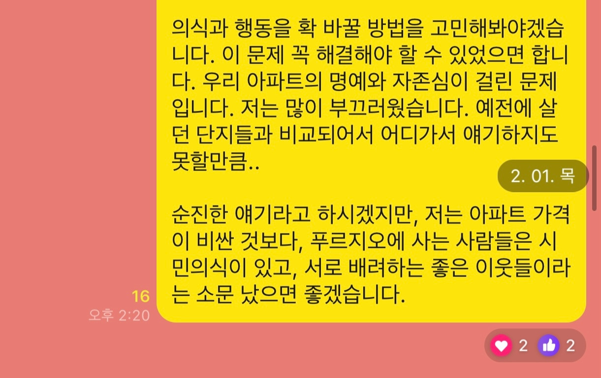 나는 우리 아파트 사람들의 의식과 행동을 확 바꿀 방법을 고민하고 있다. 이 문제는 꼭 해결해야 하고 싶다. 이것은 내가 살고 있는 아파트의 명예와 자존심이 걸린 문제이다. 나는 많이 부끄러웠다. 예전에 살던 아파트들과 비교되어서 어디 가서 얘기하지도 못할 만큼. 순진한 얘기라고 하겠지만, 나는 아파트 가격이 비싼 것보다, 여기에 사는 사람들이 시민의식이 있고, 서로 배려하는 좋은 이웃들이라는 소문났으면 좋겠다고 말했다.