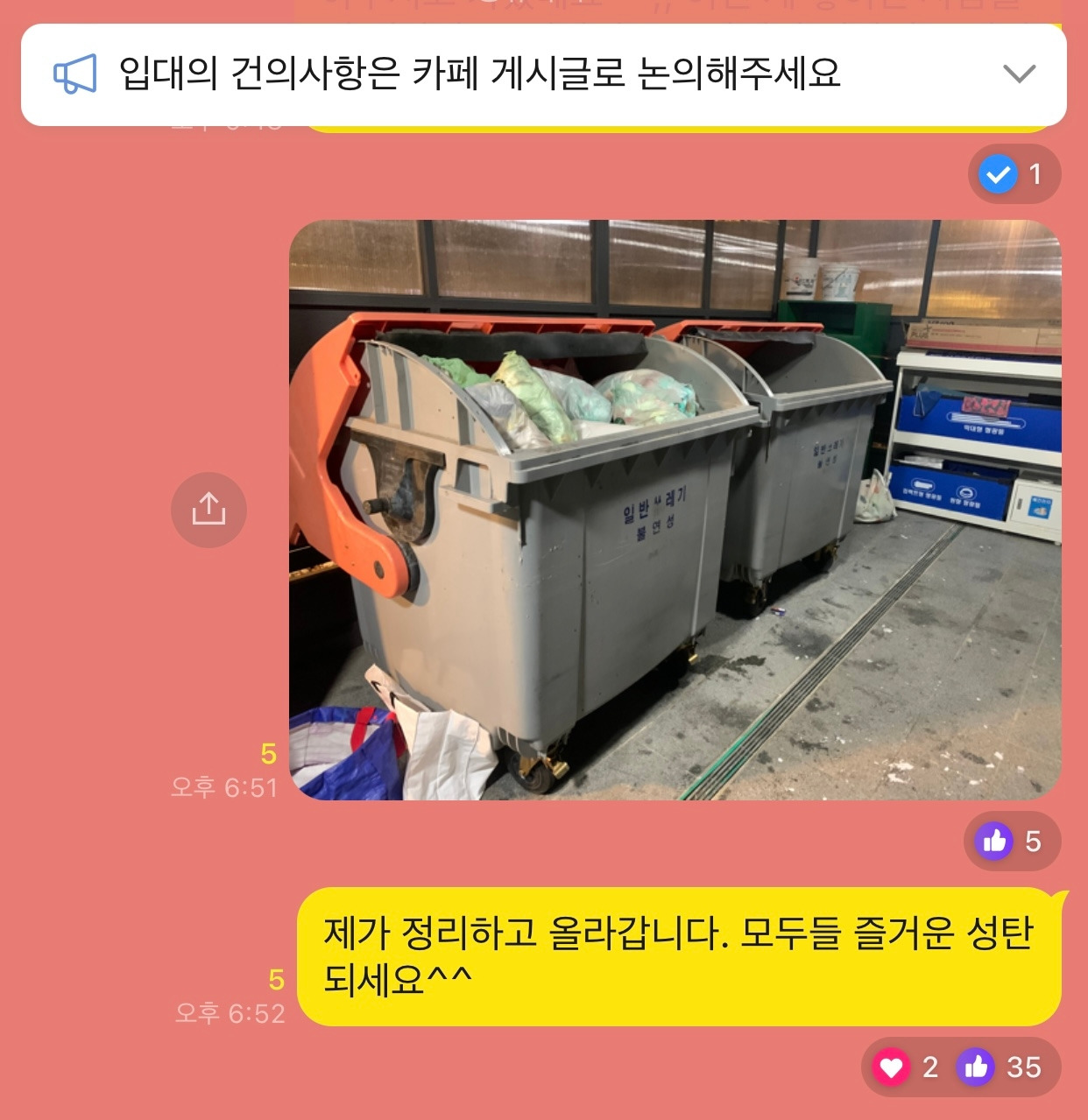 작년 성탄절 우리 아프트 분리수거장에서 내 눈살을 찌푸리게 하는 일이 있었다. 일반쓰레기는 종량제 봉투에 잘 묶어서 일반쓰레기를 분리하는 큰 통에 잘 넣어서 배출해야 하는데, 그날따라 십여 개의 봉투들이 바닥에 널브러져 있는 게 아닌가? 바로 옆에 빈 통이 있는데도 주민들이 그냥 쌓아두고 간 걸 보고 마음이 너무 불편했다. 나는 바닥에 있는 쓰레기봉투들을 일일이 큰 통에 잘 정리한 후 이렇게 아파트 단톡방에 사진과 메시지를 남겼다.
