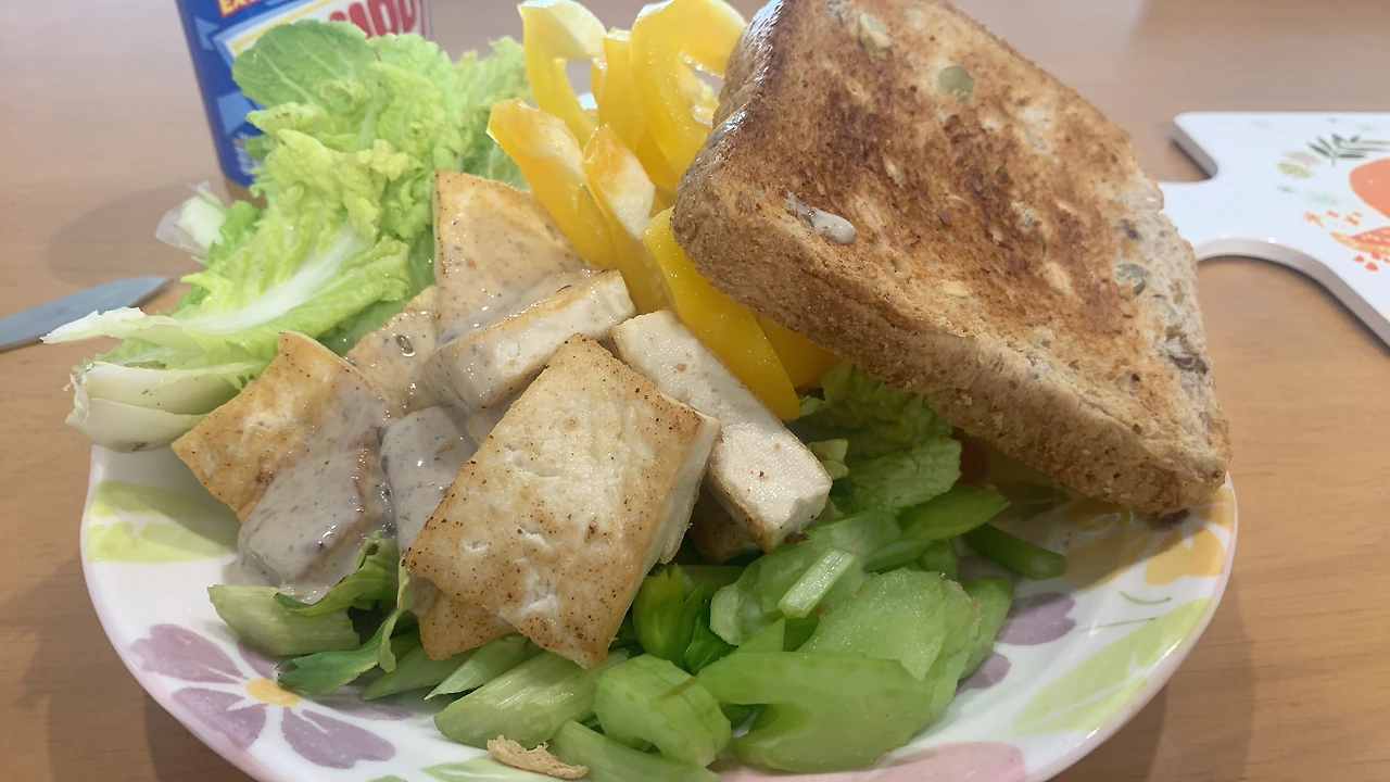 : 구운 두부, 셀리리, 파프리카. 봄동, 통밀빵