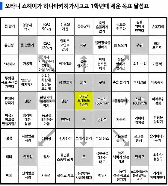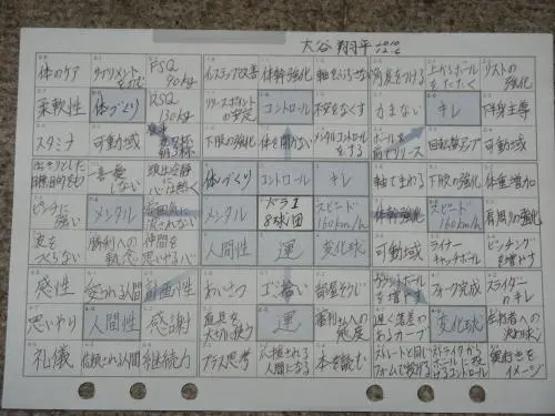 오타니가 고등학교 1학년 때부터 세웠다는 계획표는 매우 유명하다. 그중 아단 중앙에 있는 운만 살표 보면 이렇다. 인사하기, 쓰레기 줍기, 심판분을 대하는 태도, 응원받는 사람이 되기, 물건을 소중히 쓰기, 야구부실 청소, 책 읽기. 최근 메이저리그에서 올해 VIP 및 사이영상 후보로 대두되면서 그의 쓰레기 줍기가 화제가 되었다. 그는 아직도 경기가 끝나면 경기장 주변의 쓰레기를 줍는 행동을 이어가고 있다고 한다.