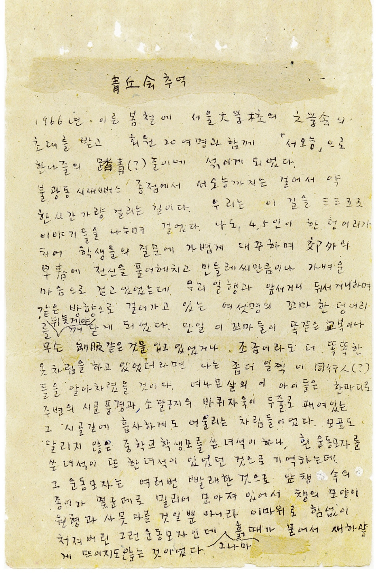 <청구회의 추억 필사본: 신영복 선생은 감옥에서 나누어주는 휴지나 메모지에 이렇게 깨알 같은 글을 썼다고 한다. 이 메모야말로 인간은 한계를 극복하며 성장하는 존재라는 것의 실존적 증거이다. >