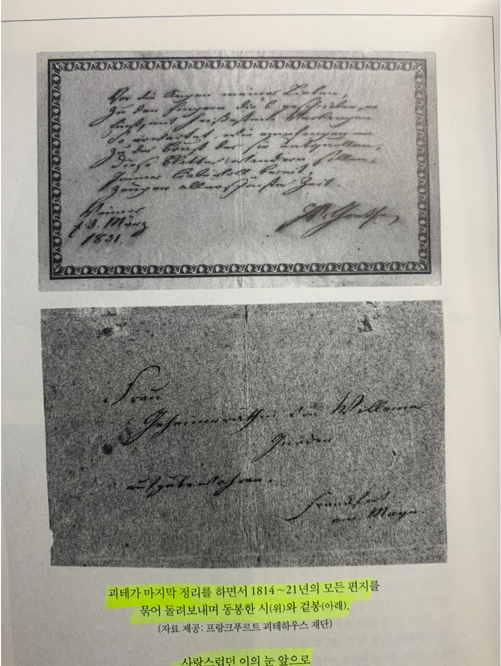 나는 이 둘이 서로 감성적, 시적으로 교류했다는 사실이 너무 가슴 아프다. 괴테가 그의 집을 떠날 때 두 내외가 하이델베르크까지 전송을 나온 이후 그들은 죽을 때까지 서로 만나지 못했고 편지 왕래도 없었다고 하셨지만 부록에 첨부된 편지들은 서로가 사랑하고 있었음을 증명하고 있다. 마리아네는 괴테를, 괴테는 마리아네는 정말 사랑하지 않았을까? 괴테는 신사도의 뒤에 숨은 채 마리아네를 그저 마음으로 염모 하기만 했을까?