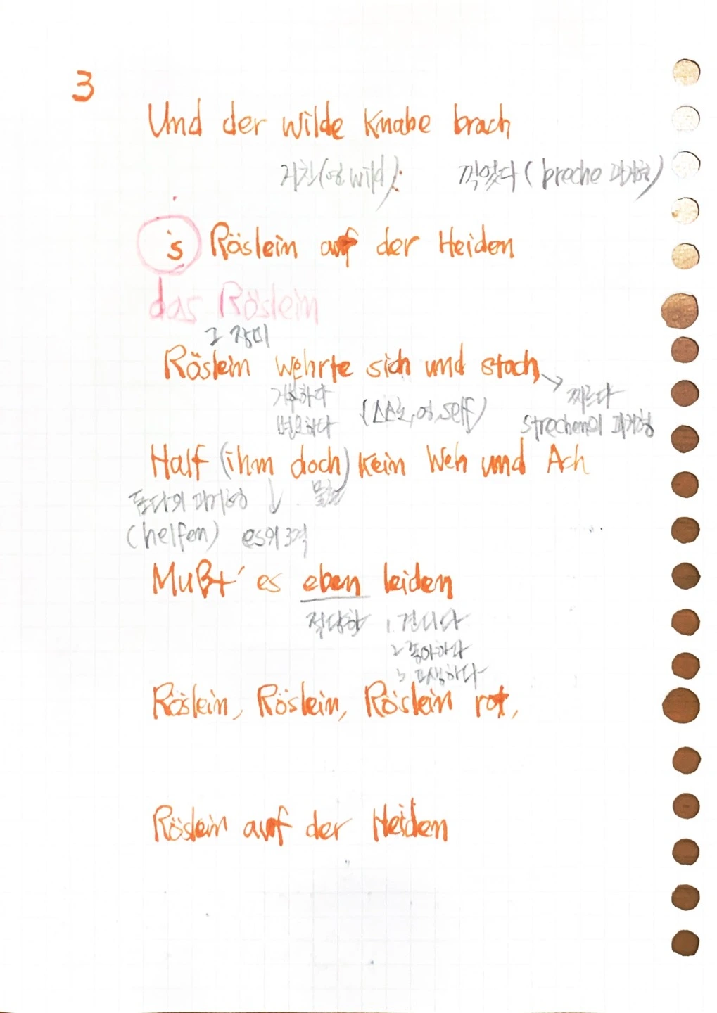 3연의 둘째 행에 보면 ‘s Röslein(그 장미)라는 표현이 있다. 이것은 Das Röslein의 줄임말이다. 다른 행과 차이를 두면서도 낭독할 때의 운율을 위해 ‘s로 표기한 것이다. 1행에서 소년은 꽃을 꺾였다. 그리고 이제 들장미는 소년에게 없어서는 안 될 의미 있는 아니 사랑하는 존재로 거듭났다.