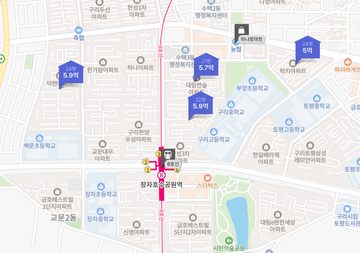 구리역 인근과 장자호수공원 인근에 학원이 꽤 많다.