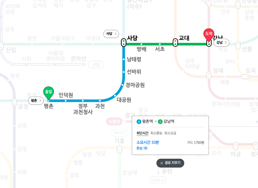 4호선 평촌역에서 강남역까지 환승 1번에 33분 소요된다.