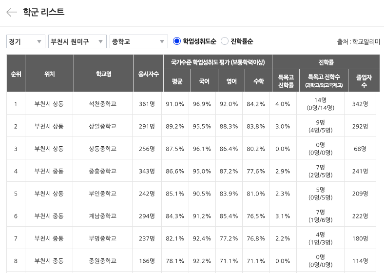 2번 상일중 학업성취도를 보면 89.2%에 특목고도 9명이나 간다.