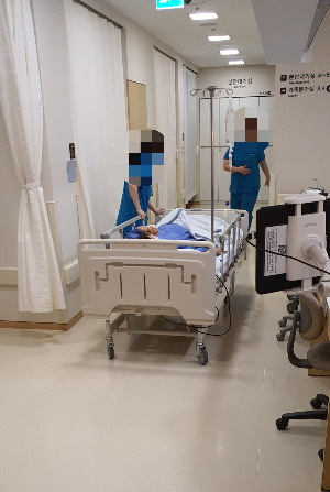 아이는 출산휴가에 들어간 지 2주 만에 태어났다. 역아였기에 38주 3일에 여유롭게 제왕절개로 출산하려고 했지만, 37주 6일 차에 갑자기 진통이 와 응급제왕절개 수술을 받았다. 그 억울하다는 진통과 수술을 동시에 겪은 케이스가 내가 된 것이다. 더군다나 제왕절개 수술 부위를 아주 예쁘게 꿰매어주신다고 소문난 임신 전 기간을 나와 함께 해준 담당 선생님이 아닌 난생처음 보는 응급 당직선생님에게 수술을 받았다는 사실. 그리고 밤새 등이 아팠지만 초산인지라 그게 진통인 줄도 모르고 아침이 되어서야 병원을 찾아 말 그대로 응급 수술을 해야 했기에 남편이 보호자 사인을 하고 있는 사이 수술실로 옮겨져 뒤늦게 발견한 남편이 울면서 달려오는 진풍경을 만들었다. 이때 남편의 눈물을 처음 본 것 같다. 남편은 수술실 앞이 처음이라 그런지 순간 다시 못 볼 것만 같고 너무 무서웠다고 한다. 그 와중에 이 사진을 찍은 남편도 참 대단하다.