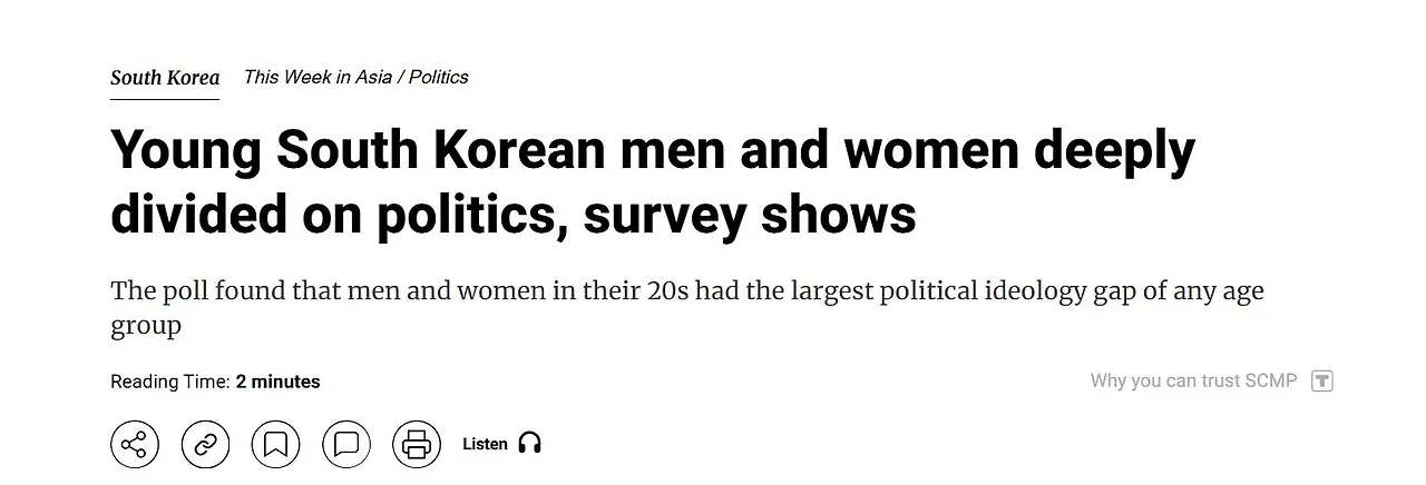 한국의 20대 남성 여성에 대한 기사가 실렸기에