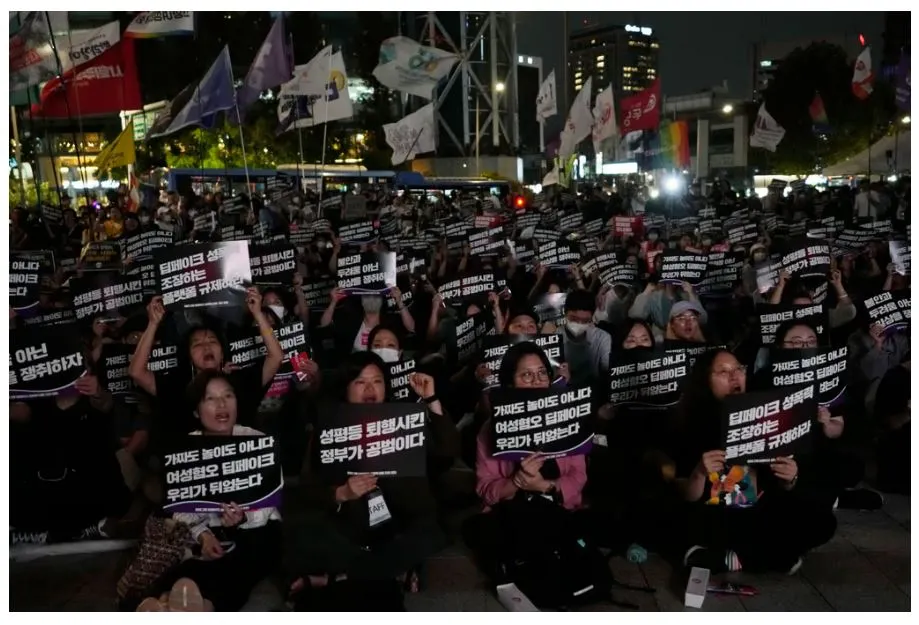 사진설명> Feminist activists stage a rally against illegal deepfake content calling for the government to enact appropriate countermeasures in Seoul, South Korea on September 6, 2024. Photo: AP 페미니스트 활동가들은 한국 서울에서 불법 딥페이크 콘텐츠에 반대하는 집회가 열렸습니다. 이들은 정부가 적절한 대책을 마련해 줄 것을 요구하는 집회를 열었습니다. 2024년 9월 6일, 사진: AP