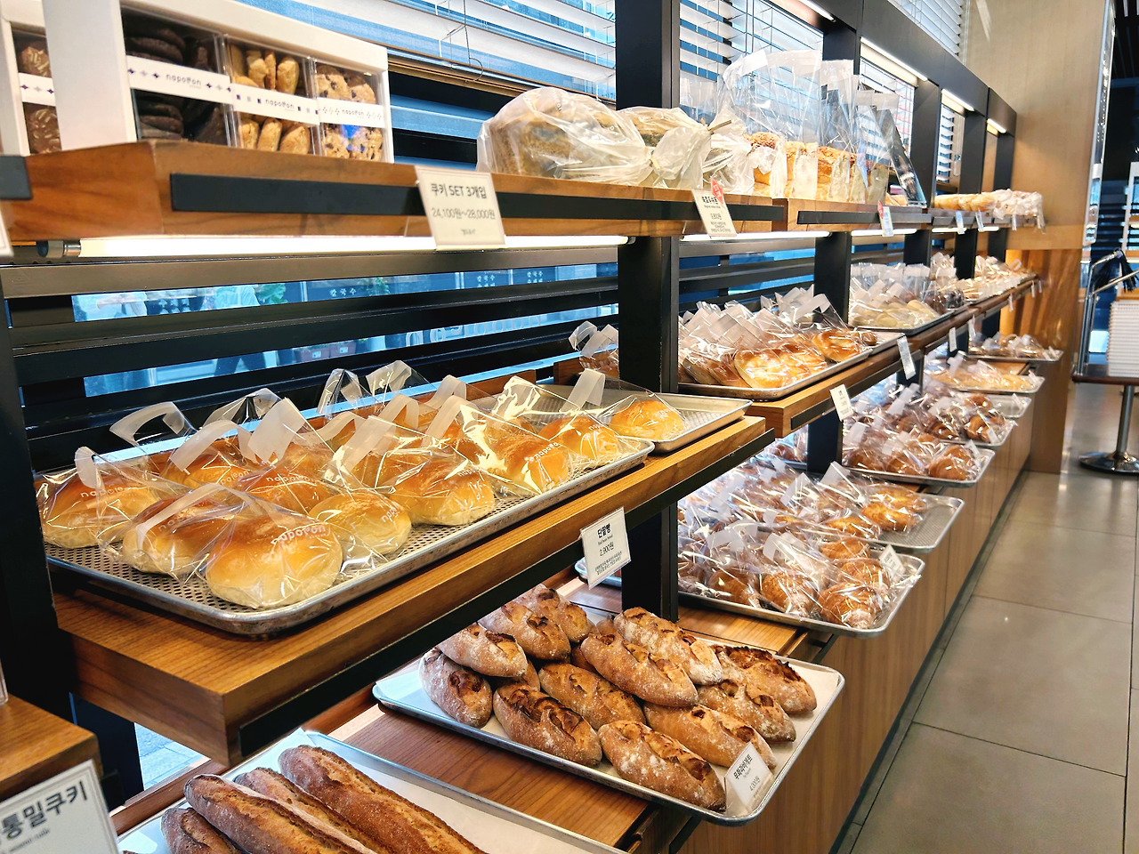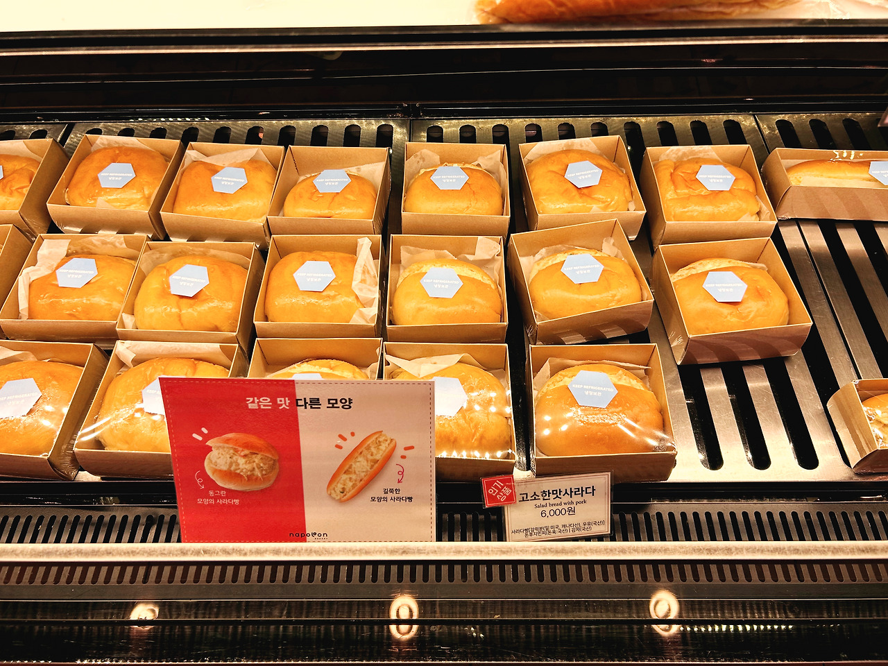 저기엔 안 나왔지만 소프트롤의 단짝친구 초코칩모닝빵도 정말 맛있고, 크림빵의 단짝친구 생크림빵은 저와 저희 집 둘째의 원픽입니다. 아, 크림빵은 노오란 빛깔이 영롱한 슈크림빵입니다. 밀크식빵은 나폴레옹 빵맛의 가장 기본을 느낄 수 있어요. 빵을 잘 모르는 저입니다만, 한입 베어 물면 아, 좋은 재료로 갓 만든 맛있는 빵이다! 하는 느낌이 옵니다. 그리고 사라다빵은 생각하시는 그 맛이 맞긴 하는데 그 어느 빵집의 것보다 촉촉하고 고소하고 아삭하고 맛있습니다.