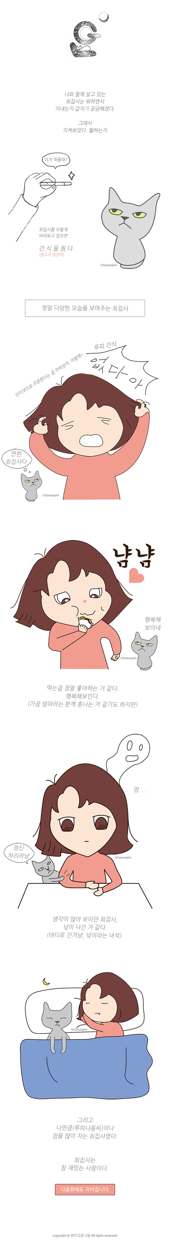 1 안녕하세요. 매주 업데이트를 해서 올려야 하는데, 정말 늦어져서 죄송합니다. (정정) 최근 일과 병행하게 되어 매주 업데이트 되었던 루피냐옹씨와의 이야기가 한달에 한번씩 업데이트 하게 되었습니다. 기다려주신 분들께 죄송하며, <최집사와 루피냐옹씨> 이야기를 봐주시고, 구독해주시는 분들께 진심으로 감사드립니다.