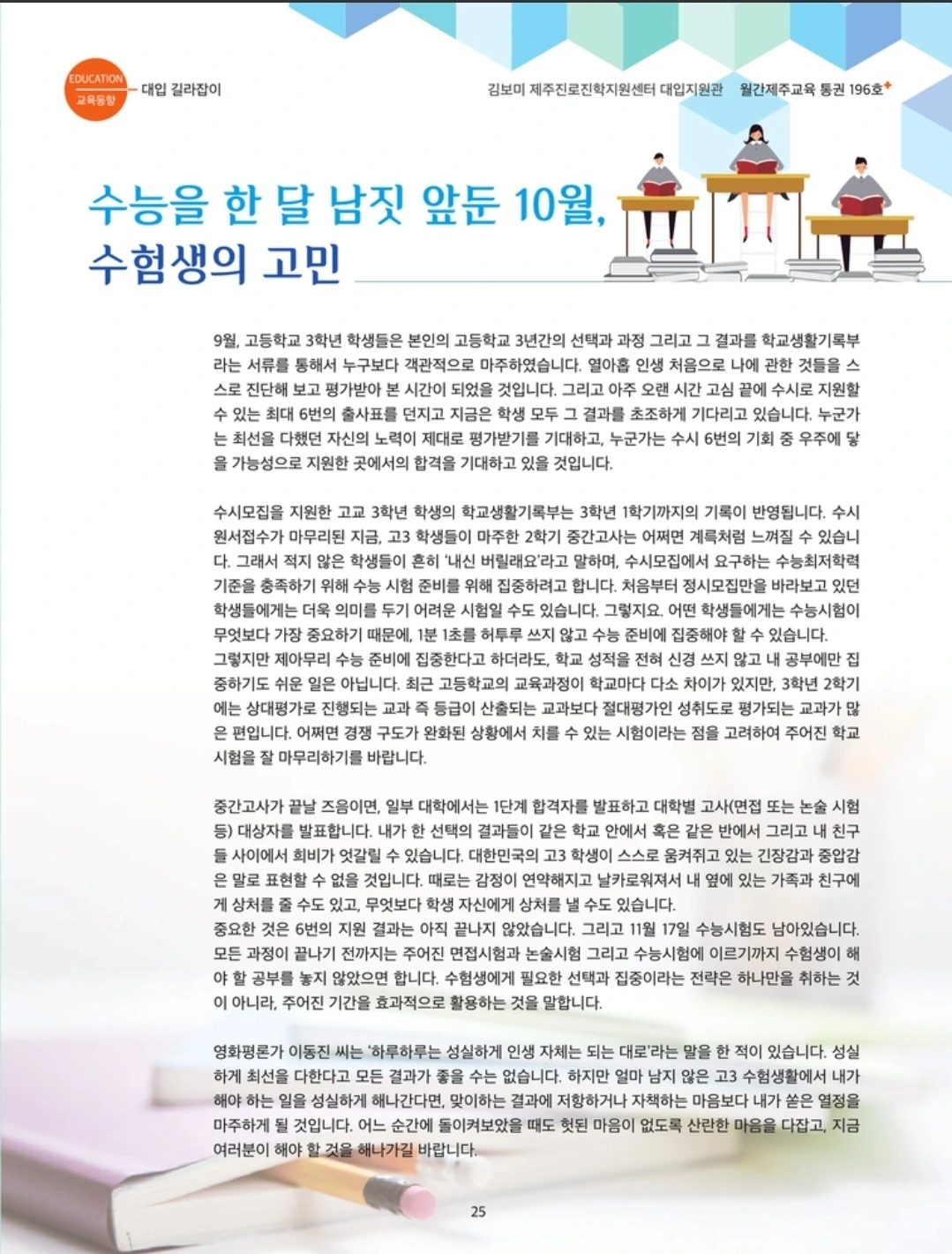 영화평론가 이동진 씨는 '하루하루는 성실하게 인생 자체는 되는 대로'라는 말을 한 적이 있습니다. 성실하게 최선을 다한다고 모든 결과가 좋을 수는 없습니다. 하지만 얼마 남지 않은 고3 수험생활에서 내가 해야 하는 일을 성실하게 해나간다면, 맞이하는 결과에 저항하거나 자책하는 마음보다 내가 쏟은 열정을 마주하게 될 것입니다. 어느 순간에 돌이켜보았을 때도 헛된 마음이 없도록 산란한 마음을 다잡고, 지금 여러분이 해야 할 것을 해나가길 바랍니다.
