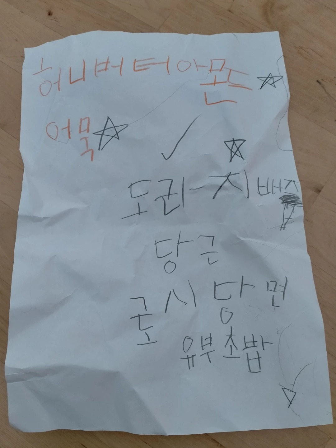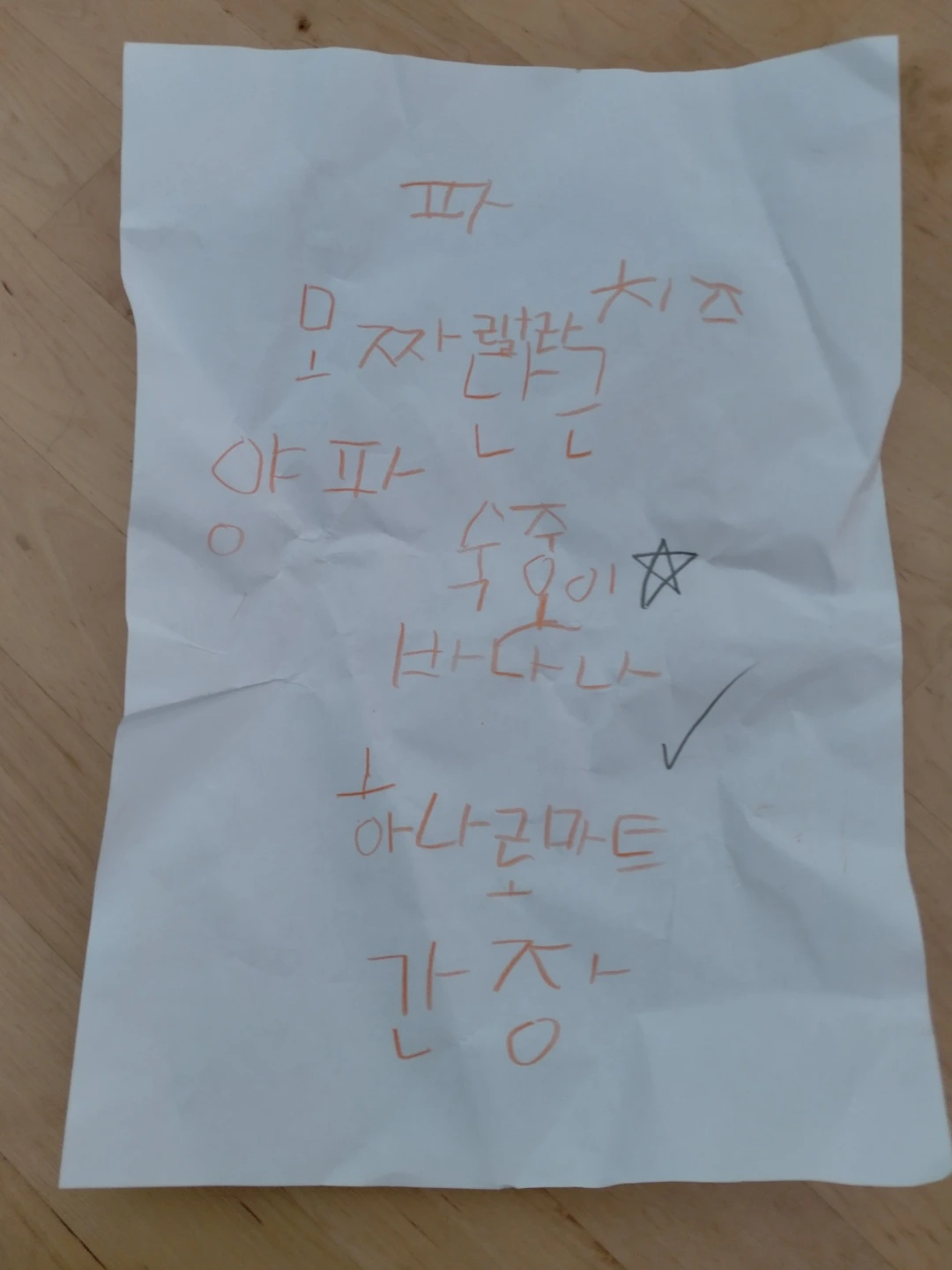 겨우 만 5살인데 이렇게 장보기 목록도 쓰다니 참 신통방통하다.