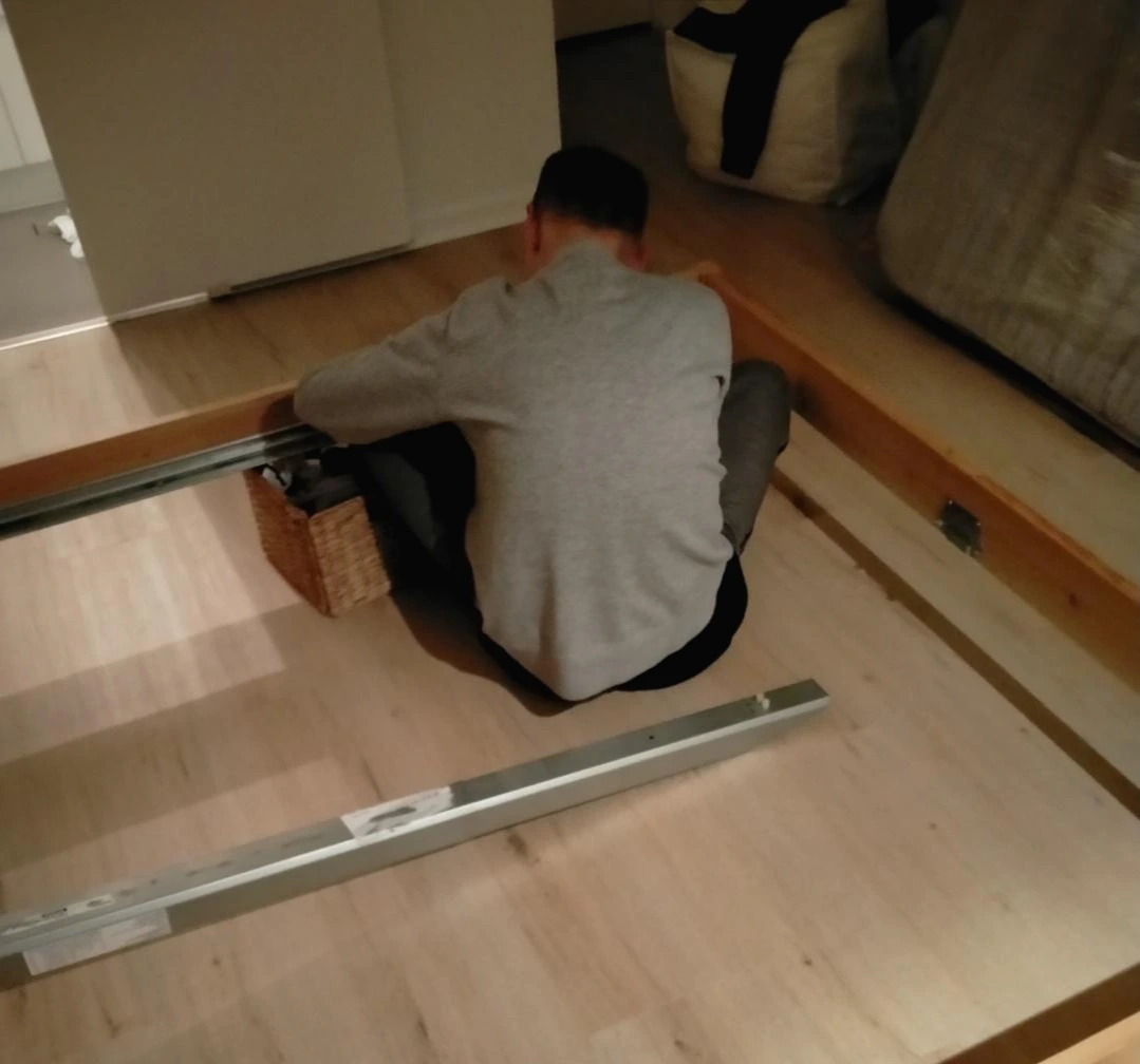 첫날 자려고 침대 조립하고 있는 꾸물 남편.