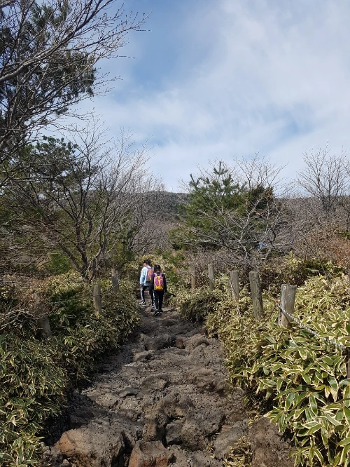 칭찬의 힘은 아이들을 한라산 정상으로 오를 수 있는, 긍정의 에너지가 되었고 우리는 많은 분들의 응원을 받아 점점 고도를 높이며 진달래밭대피소로 향했다. 1.5km의 거리고 평균 1시간 정도 걸린다고 하는 구간, 우린 여전히 돌길을 열심히 걸었고, 진달래밭대피소에 도착을 했다.