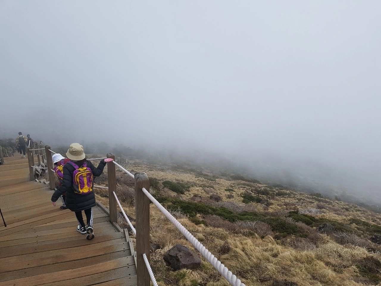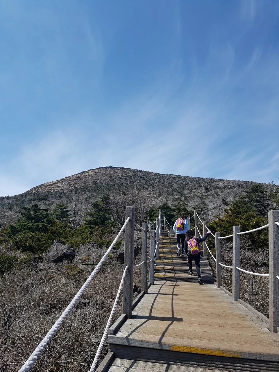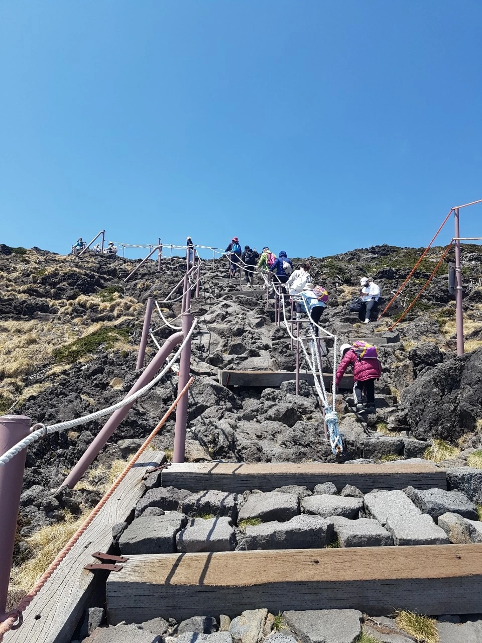 해발 1800m를 지났을 때였다. 산 넘어 산이 아니라, '산 위에 산'이란 말이 생각났다. '헉. 산 하나를 더 올라가야 백록담이 나오는구나.' 그런데 이때부터였다. 돌길도 돌길이지만 정상까지 올라가는 길의 경사가 많이 가팔랐다. 허벅지가 터질 듯, 이러다 다리근육이 파열되는 건 아닌가 싶을 만큼 아팠다. 그렇게 힘들었던 돌길 그리고 큰 바위길과 많고 많았던 계단을 하나씩 참으며 올라왔는데, 나와 아이들 눈에 보였던 '밧줄'.