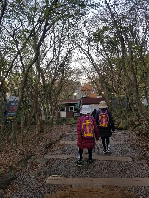 15분의 달콤한 휴식 다음, 우리의 목적지는 1.7km 떨어진 사라오름이다. 평균 40분 정도 소요된다고 하니 조금은 가벼운 마음으로 발걸음을 옮겼다. 평탄한 길이었지만, 오르막이 시작되는 사라오름으로 가는 길, 아이들의 몸에 땀이 나기 시작했다. 산을 오르며 더워지면 외투를 벗어 가방에 넣고, 올라가다 쉬는 동안 추워지면 다시 옷을 꺼내 입고, 그렇게 가방에 옷을 넣었다 뺐다를 반복하며, 걷는 시간과 동일하게 많은 시간을 소모했던 '옷의 입고 벗음의 시간들'.