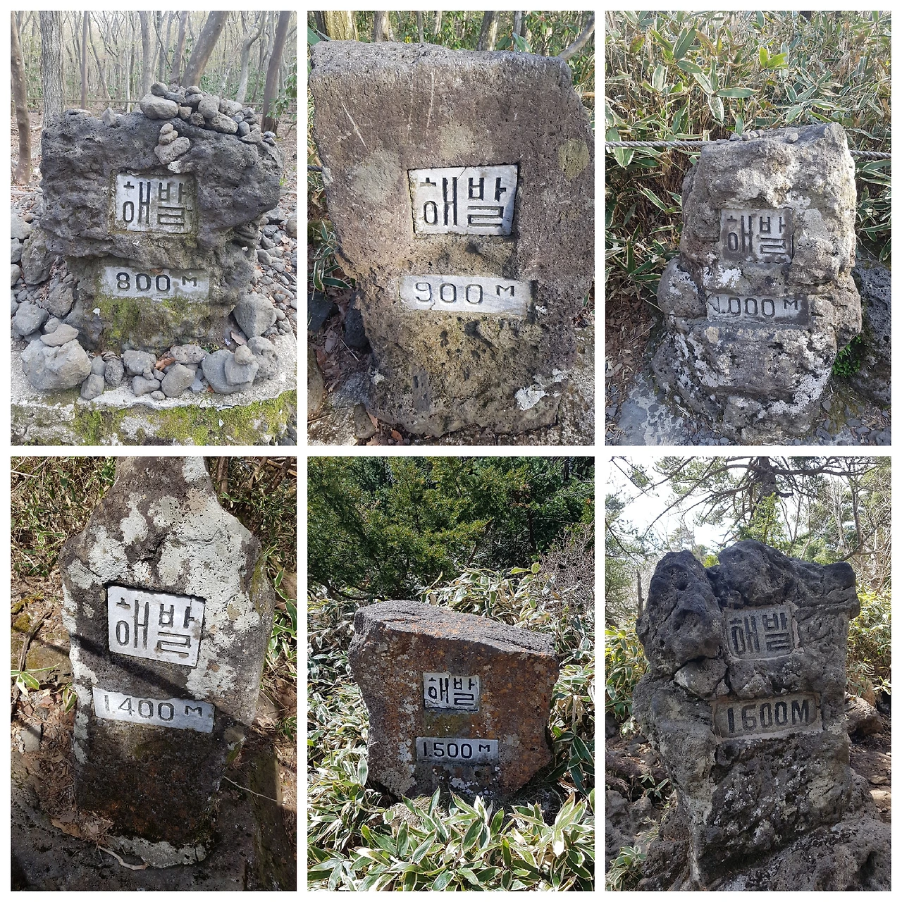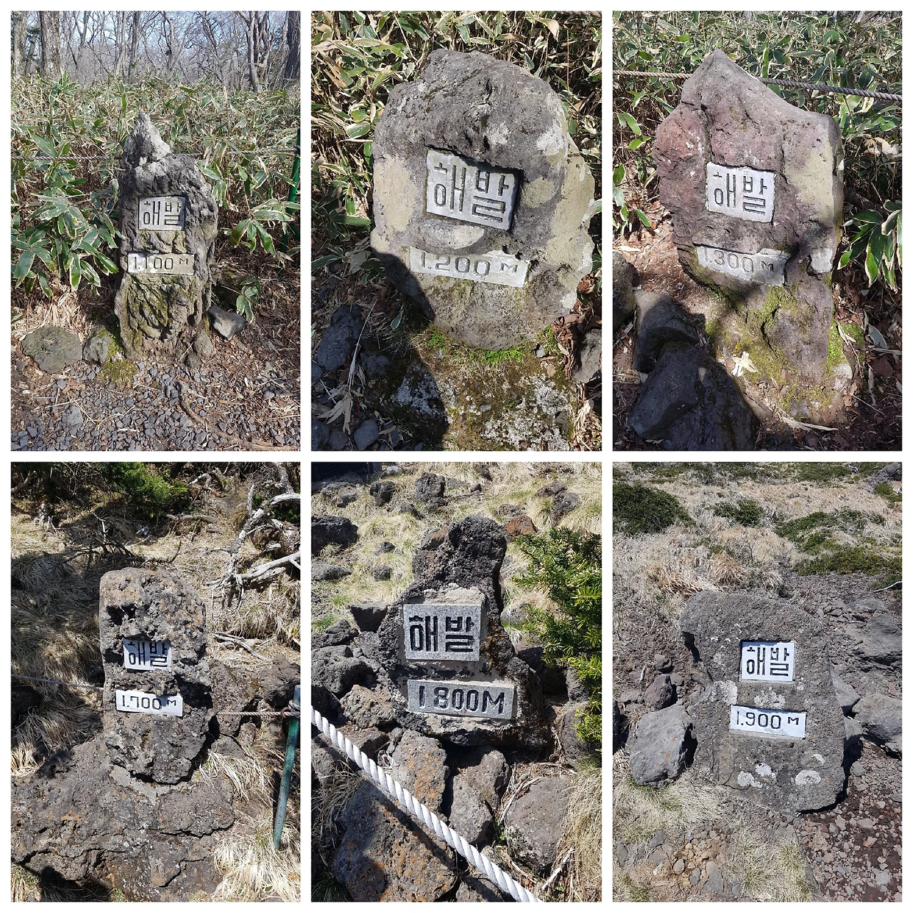 한라산 정상에 오르며 해발고도를 알려주는 비석들.