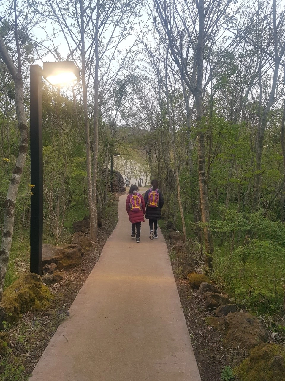우리의 숙소(휴양관)는 교래자연휴양림 안에서도 제일 안쪽에 자리 잡고 있어 휴양림 입구까지 약간의 경사가 있는 길을 거쳐 총 300m를 걸어가야 한다. 걸어가는 숲길의 중간중간 '뱀조심'이라는 안내판이 새벽의 고요한 분위기 속, 뱀이 나오지는 않을까? 하는 무서웠던 마음을 더해, 아이들의 긴장감은 더욱 커졌고, 나는 15분 후 우리가 타고 갈 택시가 '총알택시'만 아니길 바라고 또 바랬던 것 같다.
