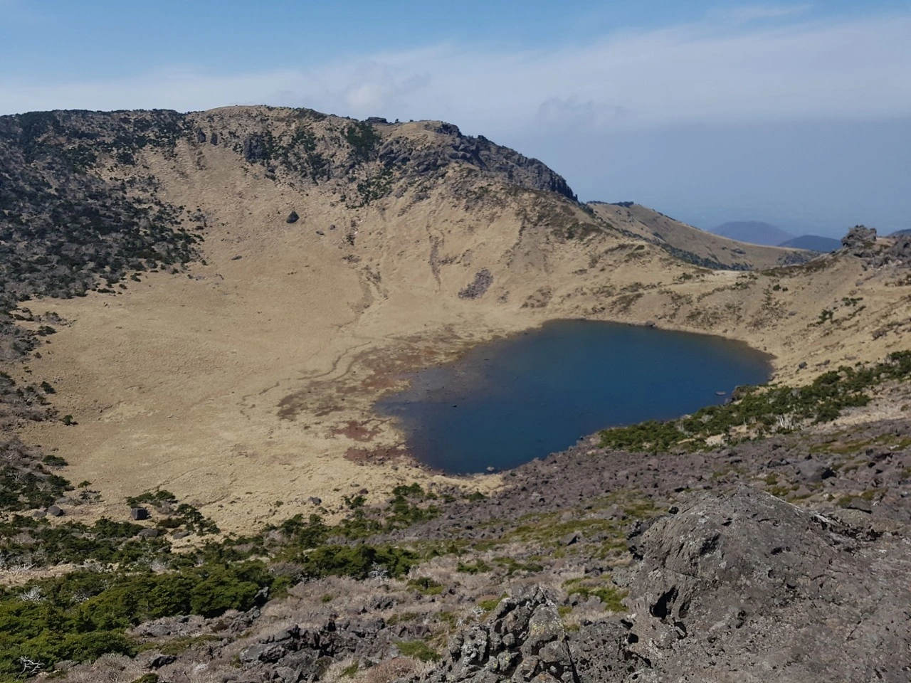 우리는 한라산 정상의 백록담을 천천히 둘러보았다. 며칠 전 비가 와서 그랬는지 무언가 파란 듯, 신비로운 색깔로 백록담 안을 채우고 있었던 물이 환상적으로 보였고 백록담 아래로 구름들이 떠다니며 바람을 타고 이동하는 모습조차 너무 신기했다. 내 마음속에 오래오래 담아두고 싶을 만큼 아름다웠던 백록담이었다.