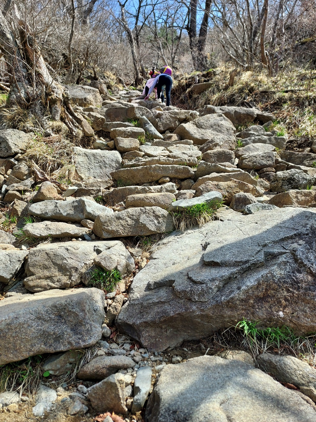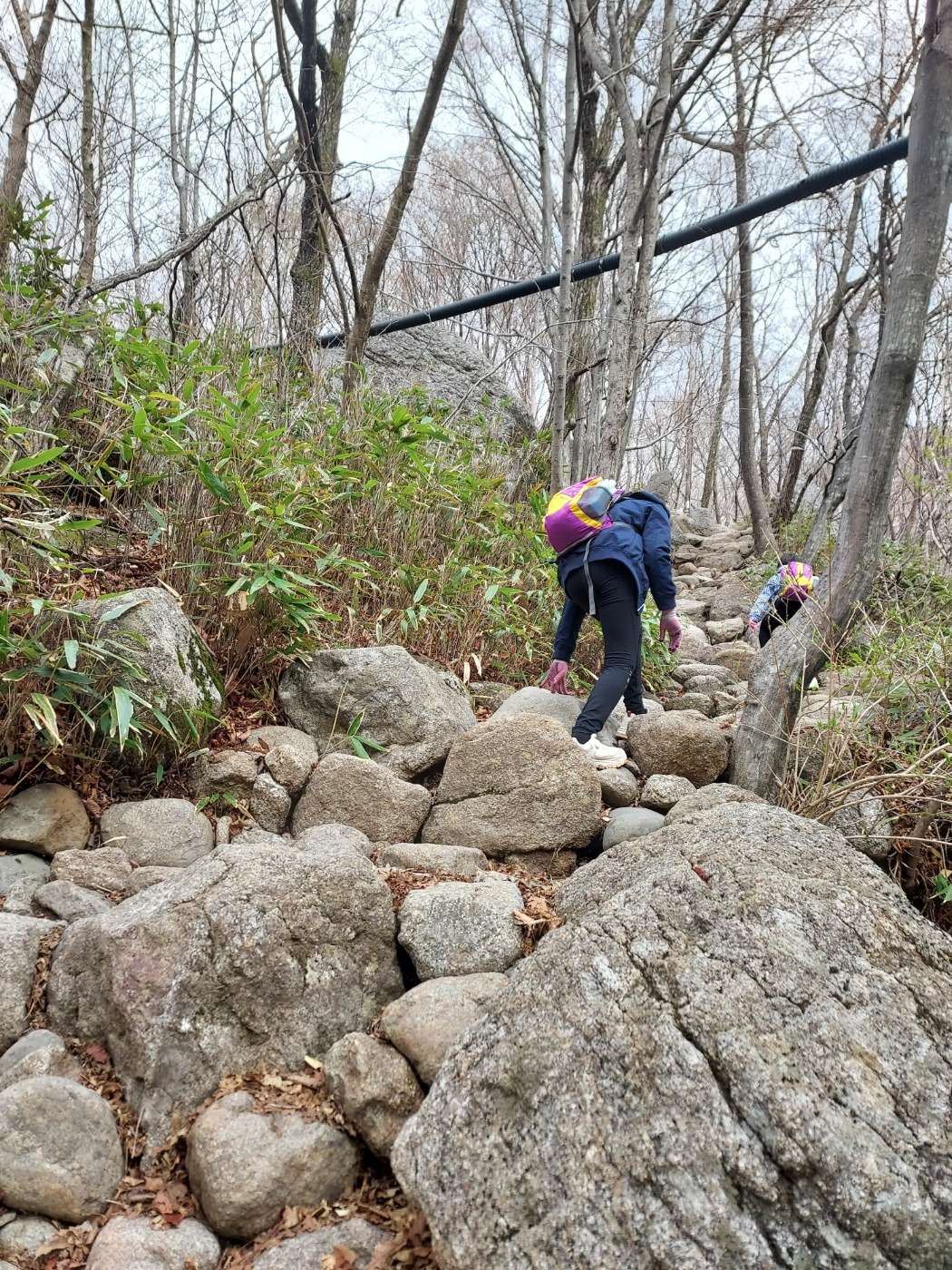 아이들과 돌길이 많은 산을 오를 땐, 미끄럼방지가 되어있는 '장갑' 착용은 필수인 것 같다. 돌길뿐만이 아니라, 산을 오르내리며 나뭇가지를 잡아야 할 때도 굉장히 도움이 많이 되었다. 그리고 밑창이 두꺼운 재질로 되어있는 신발을 신어야 발바닥과 다리에도 무리가 덜 갈 것 같다는 생각을 해 본다.