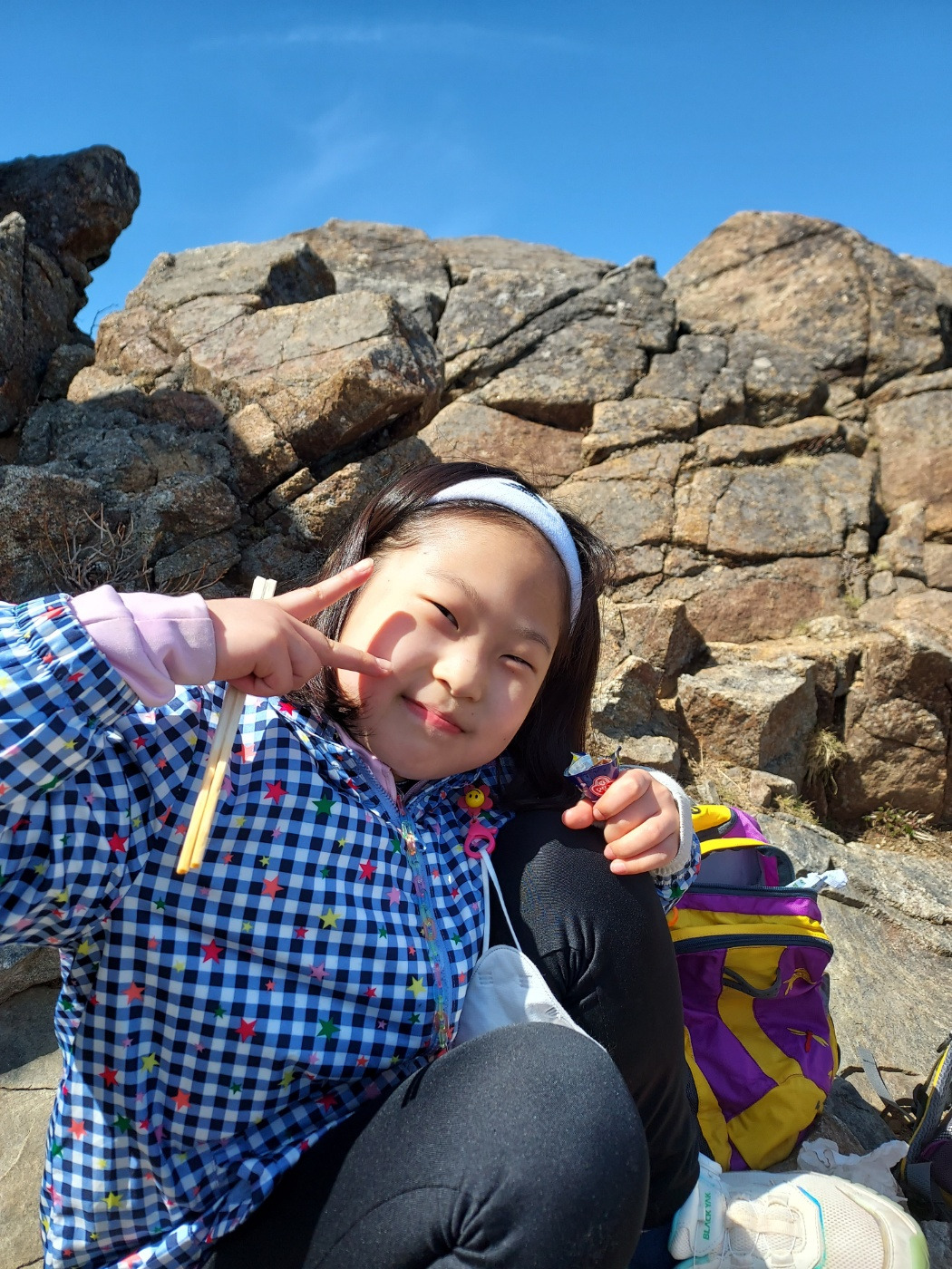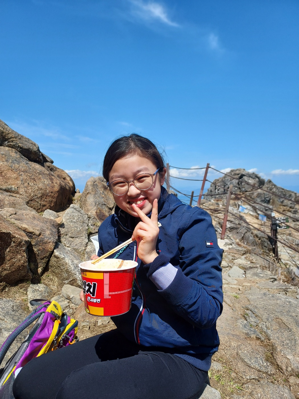 이제 우리도 점심을 먹어야 할 시간, 정상의 한쪽 귀퉁이에 앉아 가방을 열었는데! 큰일 났다. 볶음밥통이 깨져있는 것이 아닌가! 새벽에 점심도시락을 준비하면서 플라스틱통에 볶음밥을 넣고, 첫째 아이가 산 정상에서 먹고 싶다고 했던 또 다른 한 가지 '김치면'을 먹기 위해, 보온병을 함께 넣어왔는데 보온병에 눌렸는지 부딪혔는지, 플라스틱통이 깨져 밥과 플라스틱이 지퍼백 안에서 함께 뒤섞여있었다. 너무 속상했다.