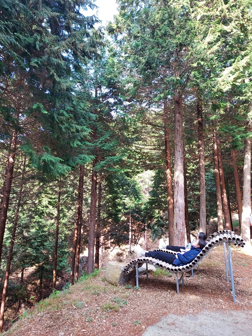 세상에.. 빽빽하게 하늘로 뻗은 편백나무가 내가 와있는 이곳이 편백나무숲임을 실감 나게 했다. 빗방울이 떨어지며 축 늘어지는 편백나무잎, 불어오는 바람에 흔들리는 편백나무줄기, 비로 인해 더 짙어 보이는 편백나무들이 더 운치 있는 분위기를 자아냈다.