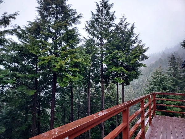 하동편백자연휴양림 마음소리방 비 오는 베란다 뷰.